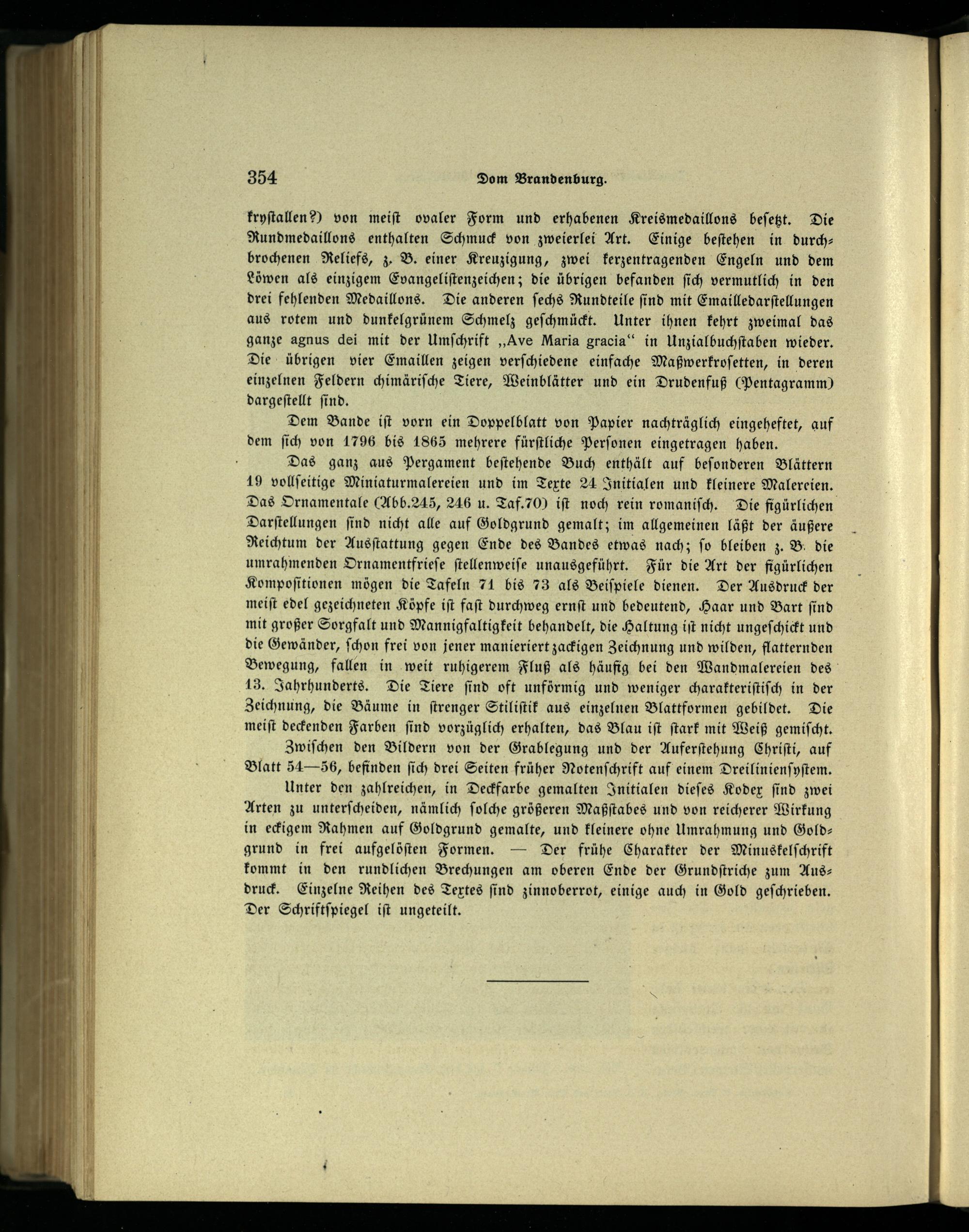 Das ganz aus Pergament beſtehende Buch enthält auf beſonderen Blättern 19 vollſeitige Miniaturmalereien und im Texte 24 Initialen und kleinere Malereien. Das Ornamentale(Abb. 245, 246 u. Taf. 70) iſt noch rein romaniſch. Die figürlichen Darſtellungen ſind nicht alle auf Goldgrund gemalt; im allgemeinen läßt der äußere Reichtum der Ausſtattung gegen Ende des Bandes etwas nach; fo bleiben z. B die umrahmenden Ornamentfrieſe ſtellenweiſe unausgeführt. Für die Art der figürlichen Kompoſitionen mögen die Tafeln 71 bis 73 als Beiſpiele dienen. Der Ausdruck der meiſt edel gezeichneten Köpfe iſt faſt durchweg ernſt und bedeutend, Haar und Bart ſind mit großer Sorgfalt und Mannigfaltigkeit behandelt, die Haltung iſt nicht ungeſchickt und die Gewänder, ſchon frei von jener manieriert zackigen Zeichnung und wilden, flatternden Bewegung, fallen in weit ruhigerem Fluß als häufig bei den Wandmalereien des 13. Jahrhunderts. Die Tiere ſind oft unförmig und weniger charakteriſtiſch in der Zeichnung, die Bäume in ſtrenger Stiliſtik aus einzelnen Blattformen gebildet. Die meiſt deckenden Farben ſind vorzüglich erhalten, das Blau iſt ſtark mit Weiß gemiſcht.