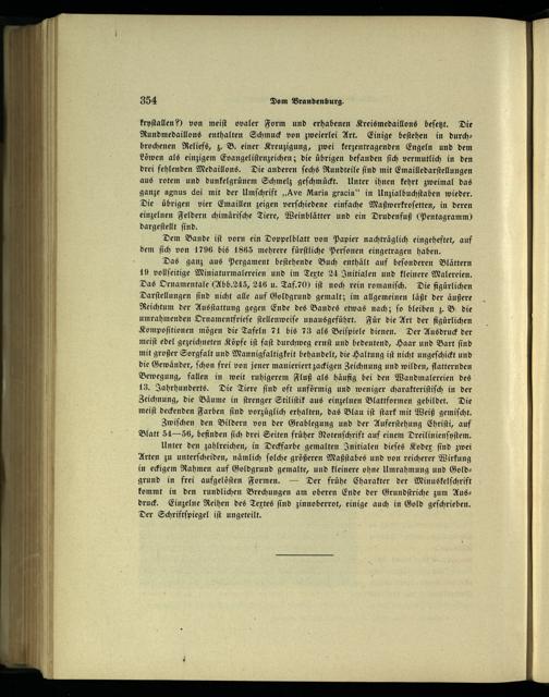 kryſtallen von meiſt ovaler Form und erhabenen Kreismedaillons beſetzt. Die Rundmedaillons enthalten Schmuck von zweierlei Art. Einige beſtehen in durch: brochenen Reliefs, z. B. einer Kreuzigung, zwei kerzentragenden Engeln und dem Löwen als einzigem Evangeliſtenzeichen; die übrigen befanden ſich vermutlich in den drei fehlenden Medaillons. Die anderen ſechs Rundteile ſind mit Emailledarſtellungen aus rotem und dunkelgrünem Schmelz geſchmückt. Unter ihnen kehrt zweimal das ganze agnus dei mit der Umſchrift„Ave Maria gracia“ in Unzialbuchſtaben wieder. Die übrigen vier Emaillen zeigen verſchiedene einfache Maßwerkroſetten, in deren einzelnen Feldern chimäriſche Tiere, Weinblätter und ein Drudenfuß(Pentagramm) dargeſtellt ſind.