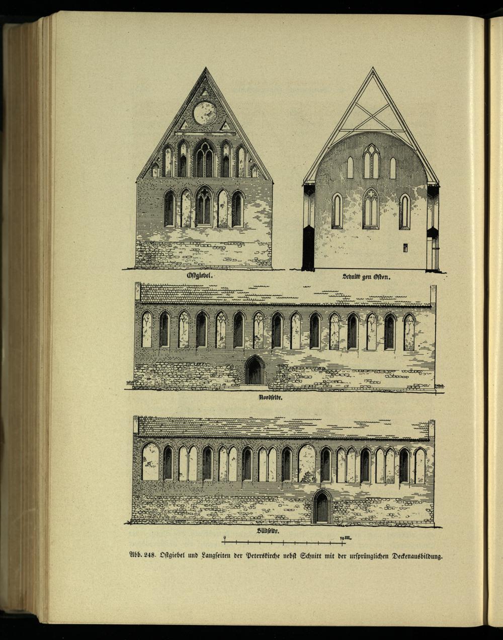 — Abb. 248. Oſtgiebel und Langſeiten der Peterskirche nebſt Schnitt mit der urſprünglichen Deckenausbildung.