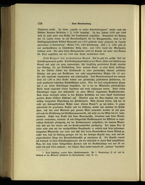 Odalricus wirkte. In dieſer„capella in castro Brandenburgensi“ wurde nach den Pöhlder Annalen Pribislav i. J. 1150 beigeſetzt. In den Jahren 1179 und 1188 wird ſie nicht unter dem Beſitze des Domkapitels angeführt. Vermutlich ſeit Anfang des 13. Jahrh. diente ſie als Parochialkapelle für die Burggemeinde, denn in der Beſtätigungsurkunde Biſchof Gernands von 1225 geſchieht eines, Johannis de Capella parrochiani in Brandeburg “(Riedel VII; 140) Erwähnung. Erſt i. J. 1237 geht fie aus markg räflichem in biſchöflichen Beſitz über, was 1254 durch den Markgrafen beſtätigt wird. Bei allen dieſen Gelegenheiten wird die Kapelle nie unter dem Namen St. Petri angeführt, der bis 1183 dem Dome vorbehalten blieb.