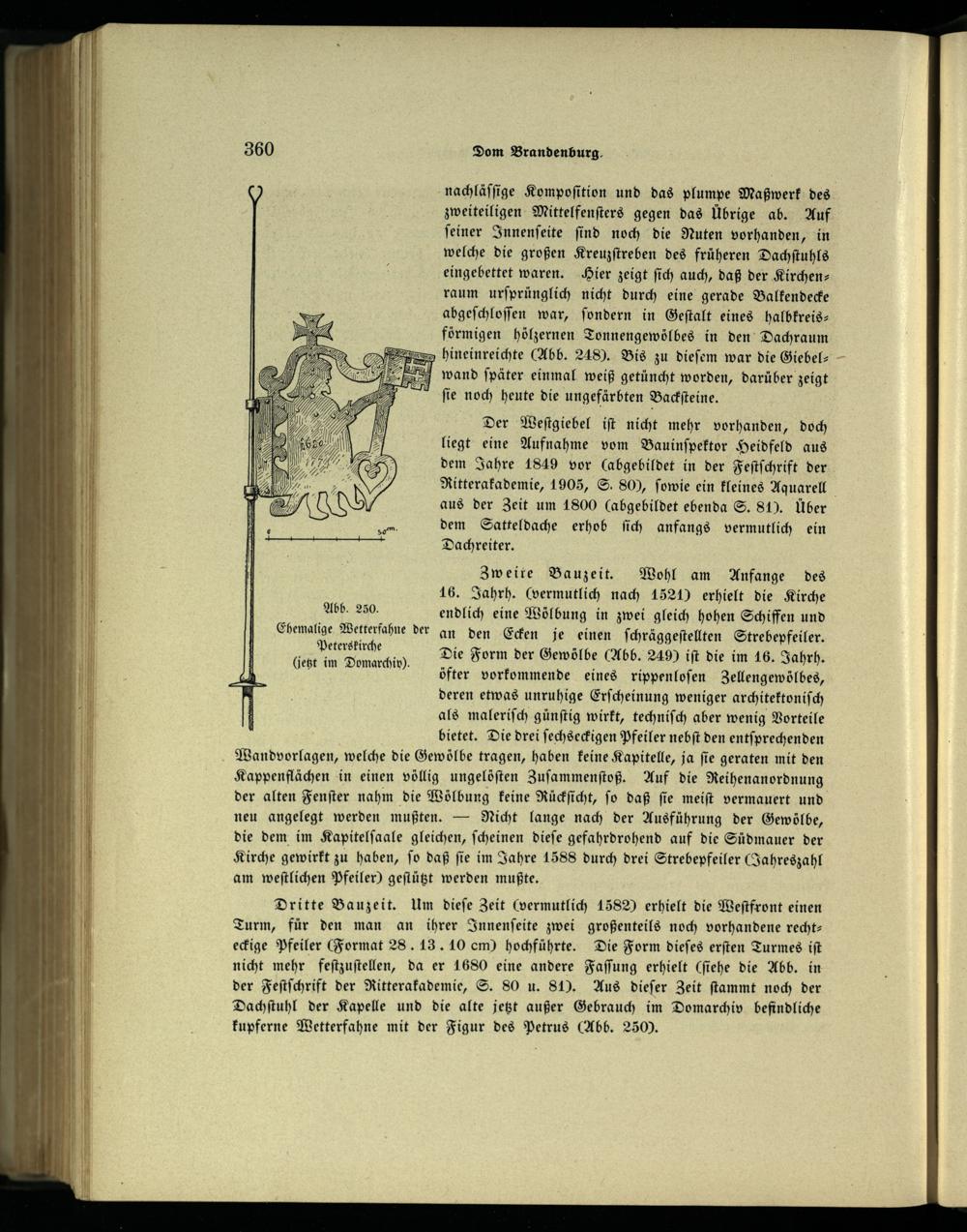 Dritte Bauzeit. Um dieſe Zeit(vermutlich 1582) erhielt die Weſtfront einen Turm, für den man an ihrer Innenſeite zwei großenteils noch vorhandene recht— eckige Pfeiler(Format 28. 13. 10 em) hochführte. Die Form dieſes erſten Turmes iſt nicht mehr feſtzuſtellen, da er 1680 eine andere Faſſung erhielt(ſiehe die Abb. in der Feſtſchrift der Ritterakademie, S. 80 u. 814). Aus dieſer Zeit ſtammt noch der Dachſtuhl der Kapelle und die alte jetzt außer Gebrauch im Domarchiv befindliche kupferne Wetterfahne mit der Figur des Petrus (Abb. 250.