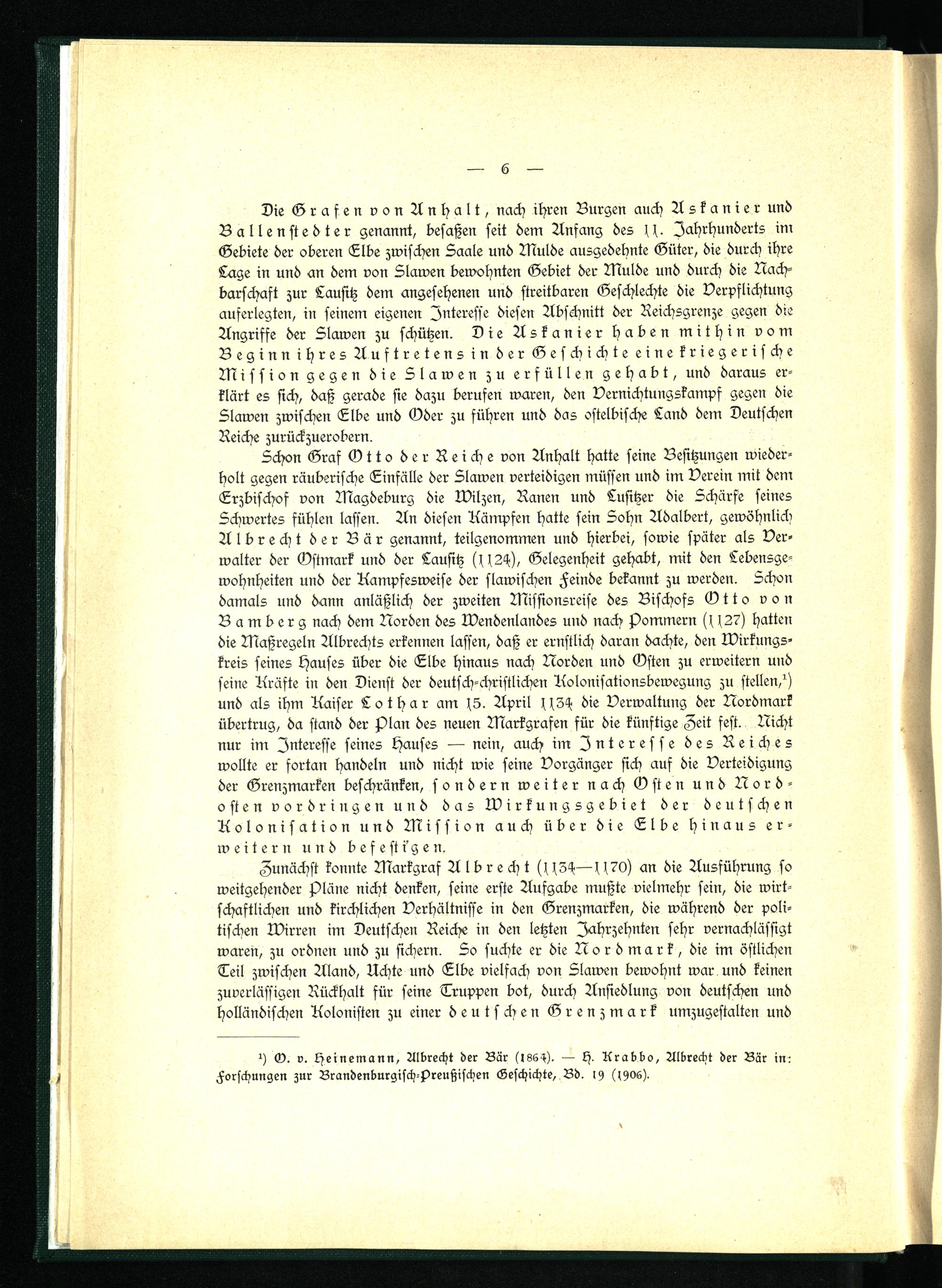 Schon Graf Otto der Reiche von Anhalt hatte seine Besitzungen wiederholt gegen räuberische Einfälle der Slawen verteidigen müssen und im Verein mit dem Erzbischof von Magdeburg die Wilzen, Ranen und Lusitzer die Schärfe seines Schwertes fühlen lassen. An diesen Rümpfen hatte sein Sohn Adalbert, gewöhnlich Albrecht der Bär genannt, teilgenommen und hierbei, sowie später als Verwalter der Ostmark und der Lausitz (1124), Gelegenheit gehabt, mit den Lebensgewohnheiten und der Kampfesweise der slawischen Feinde bekannt zu werden. Schon damals und dann anläßlich der zweiten Missionsreise des Bischofs Otto von Bamberg nach dem Norden des Wendenlandes und nach Pommern (1127) hatten die Maßregeln Albrechts erkennen lassen, daß er ernstlich daran dachte, den Wirkungskreis seines Hauses über die Elbe hinaus nach Norden und Osten zu erweitern und seine Kräfte in den Dienst der deutsch-christlichen Kolonisationsbewegung zu stellen,1) und als ihm Kaiser Lothar am 15. April 1134 die Verwaltung der Nordmark übertrug, da stand der Plan des neuen Markgrafen für die künftige Zeit fest. Nicht nur im Interesse seines Hauses — nein, auch im Interesse des Reiches wollte er fortan handeln und nicht wie seine Vorgänger sich auf die Verteidigung der Grenzmarken beschränken, sondern weiter nach Osten und Nordosten vordringen und das Wirkungsgebiet der deutschen Kolonisation und Mission auch über die Elbe hinaus erweitern und befestigen.
