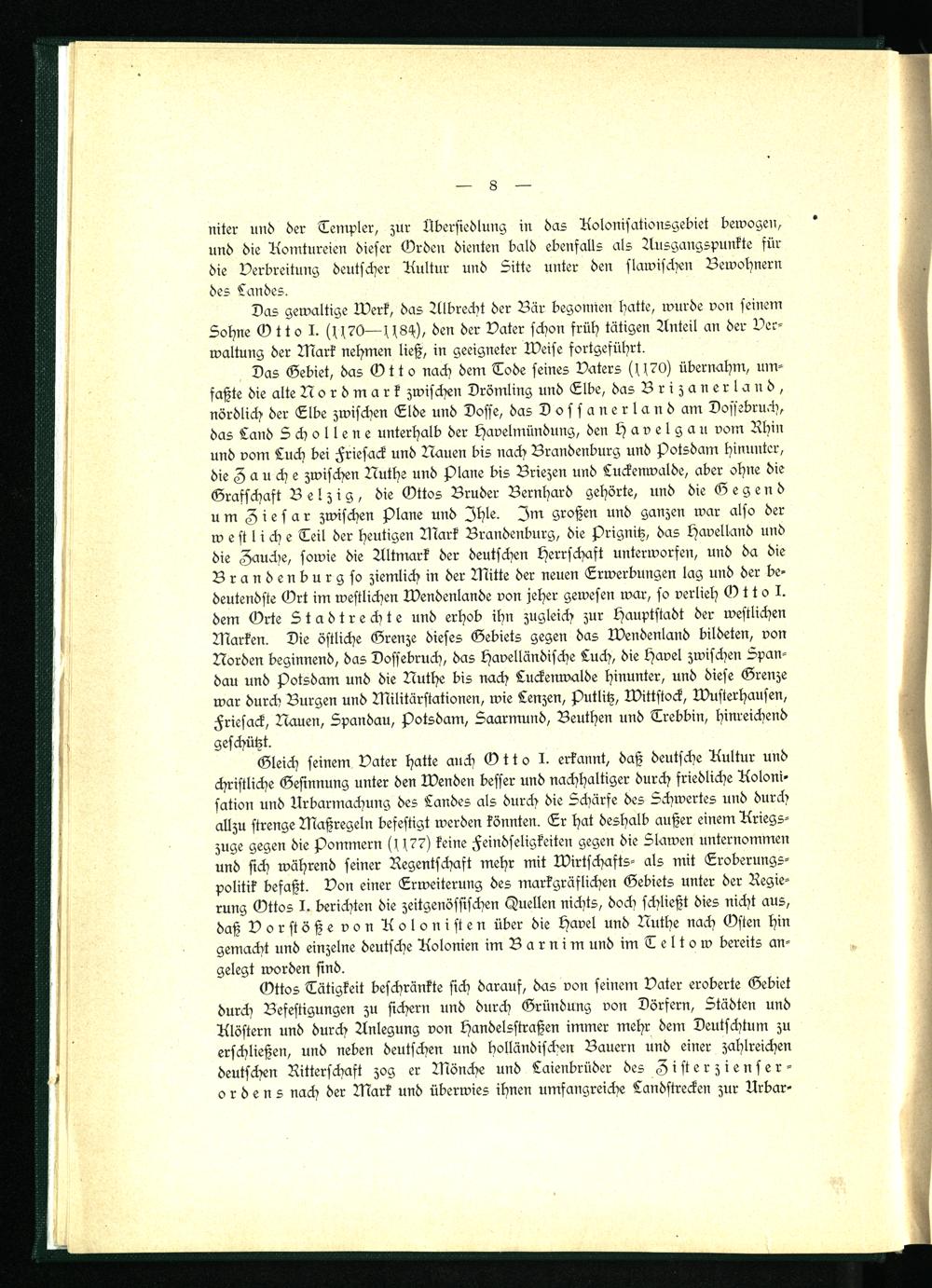 Ottos Tätigkeit beschränkte sich darauf, das von seinem Vater eroberte Gebiet durch Befestigungen zu sichern und durch Gründung von Dörfern, Städten und Klöstern und durch Anlegung von Handelsstraßen immer mehr dem Deutschtum zu erschließen, und neben deutschen und holländischen Bauern und einer zahlreichen deutschen Ritterschaft zog er Mönche und Laienbrüder des Zisterzienser- ordens nach der Mark und überwies ihnen umfangreiche Landstrecken zur Urbar-