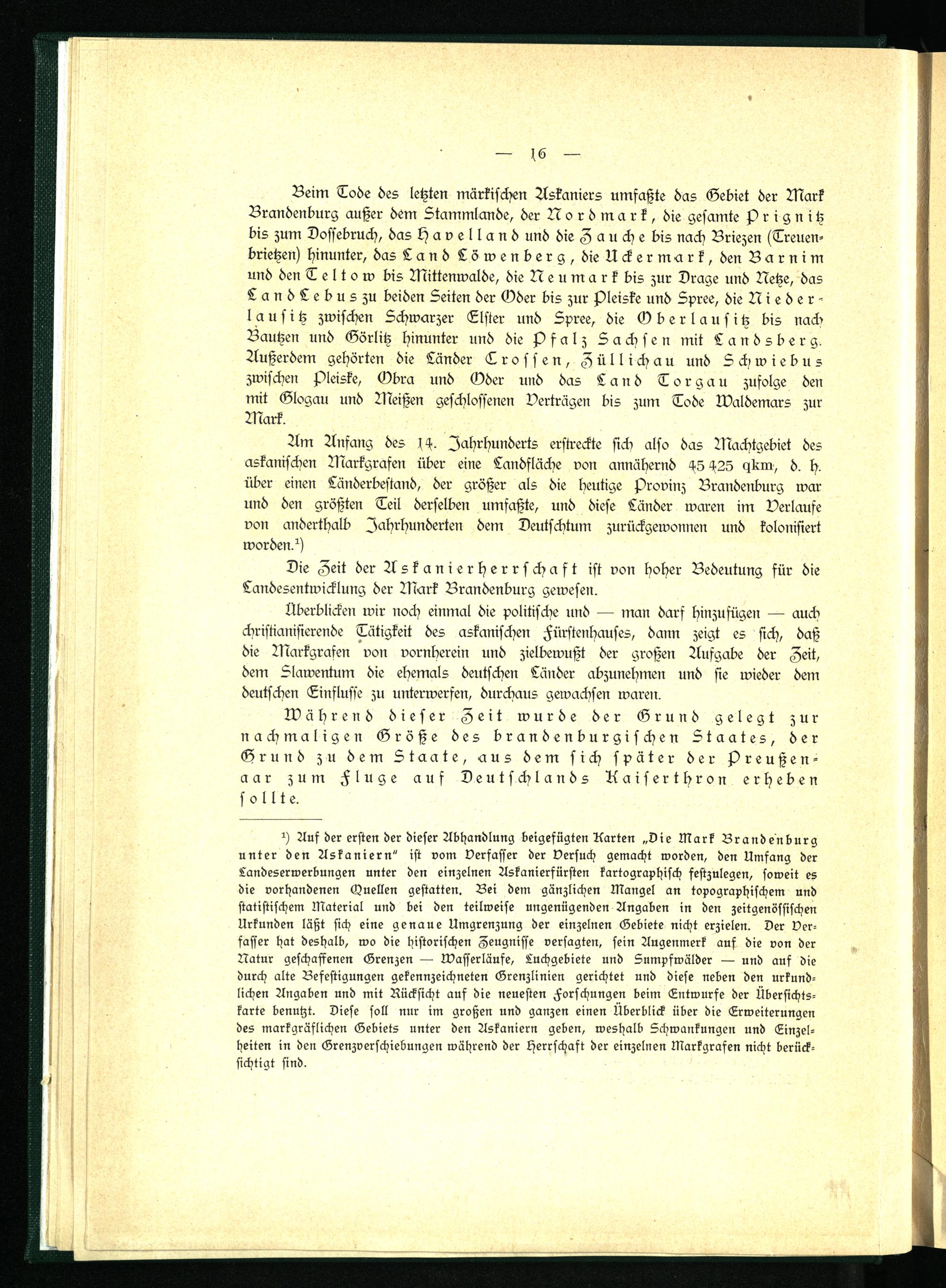 Am Anfang des 14. Jahrhunderts erstreckte sich also das Machtgebiet des askanischen Markgrafen über eine Landfläche von annähernd 45 425 qkm, d. h. über einen Länderbestand, der größer als die heutige Provinz Brandenburg war und den größten Teil derselben umfaßte, und diese Länder waren im Verlaufe von anderthalb Jahrhunderten dem Deutschtum zurückgewonnen und kolonisiert worden.1)