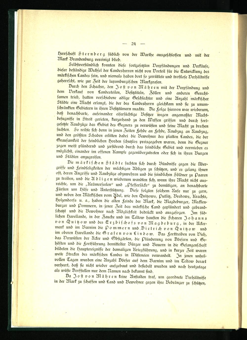 Durch den Schacher, den Jost von Nähren mit der Verpfändung und dem Verkauf von Landesteilen, Besitztiteln, Zöllen und anderen Gerechtsamen trieb, hatten verschiedene adlige Geschlechter und eine Anzahl märkischer Städte eine Nacht erlangt, die der des Landesherrn gleichkam und sie zu unumschränkten Gebietern in ihren Besitztümern machte. Die Folge hiervon war wiederum, daß benachbarte, aufeinander eifersüchtige Besitzer wegen angemaßter Nachtbefugnisse in Streit gerieten, kurzerhand zu den Waffen griffen und durch fortgesetzte Raubzüge das Gebiet des Gegners zu verwüsten und seine Nacht zu brechen suchten. So reihte sich denn in jenen Zeiten Fehde an Fehde, Raubzug an Raubzug, und den größten Schaden erlitten dabei die Bewohner des platten Landes, die der Grausamkeit der feindlichen Horden schutzlos preisgegeben waren, denn die Gegner zogen meist plündernd und zerstörend durch das feindliche Gebiet und vermieden es möglichst, einander im offenen Kampfe gegenüberzutreten oder sich in ihren Burgen und Städten anzugreifen.