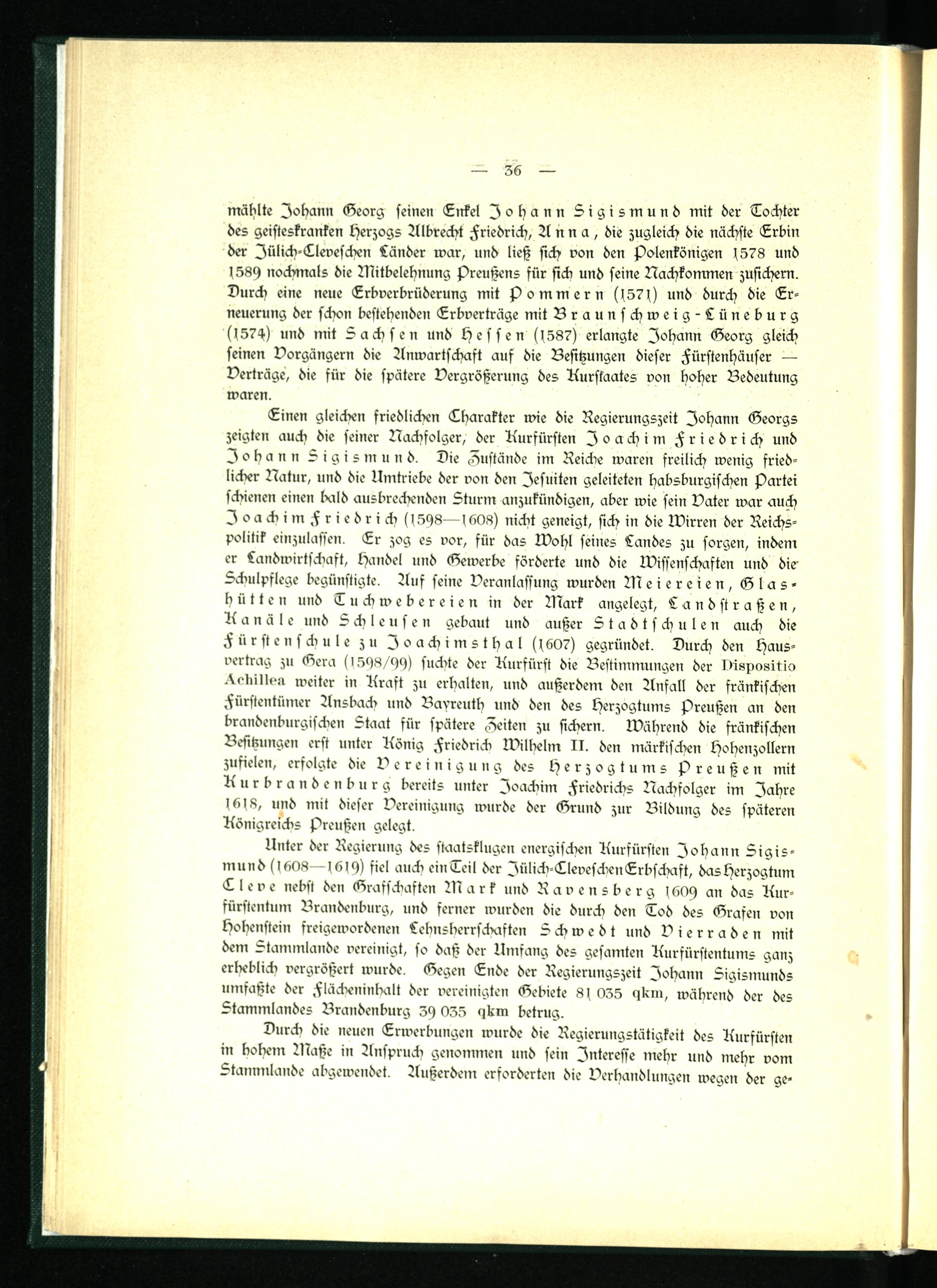 Einen gleichen friedlichen Tharakter wie die Regierungszeit Johann Georgs zeigten auch die seiner Nachfolger, der Kurfürsten JoachimFriedrich und Johann Sigismund. Die Austände im Reicke waren freilich wenig friedlicher Natur, und die Amtriebe der von den Jesuiten geleiteten habsburgischen Partei schienen einen bald ausbrechenden Sturm anzukündigen, aber wie sein Vater war auch I o a ch i m F r i e d r i cb (1598—1608) nicht geneigt, sich in die Wirren der Reichspolitik einzulassen. Er zog es vor, für das Wohl seines Landes zu sorgen, indem er (andwirtscbaft, Handel und Gewerbe förderte und die Wissenschaften und dio Scbulpslege begünstigte. Auf seine Veranlassung wurden Meiereien, Glashütten uud Tuchwebereien in der Mark angelegt, Landstraßen, K a näle und Schleusen gebaut und außer Stadtschulen auch die Fürsten sch ule zu Joachimsthal (1607) gegründet. Durch den Hausvertrag zu Gera ( > 598/99) suchte der Kurfürst die Bestimmungen der Msposilio .Veliillou weiter in Kraft zu erhalten, und außerdem den Anfall der fränkischen Fürstentümer Ansbach und Bayreuth und den des Herzogtums Preußen an den brandcnburgischen Staat für spätere Jeiten zu sichern. Während die fränkischen Besitzungen erst unter König Friedricb WiIllelm II. den märkischen Hohenzollern zufielen, erfolgte die Vereinigu » g des Herzogtums Preußen mit K u r b r a n d e n b u r g bereits unter Joachim Friedrichs Nachfolger im Jahre 1618, und mit dieser Vereinigung wurde der Grund zur Bildung des späteren Königreicbs Preußen gelegt.