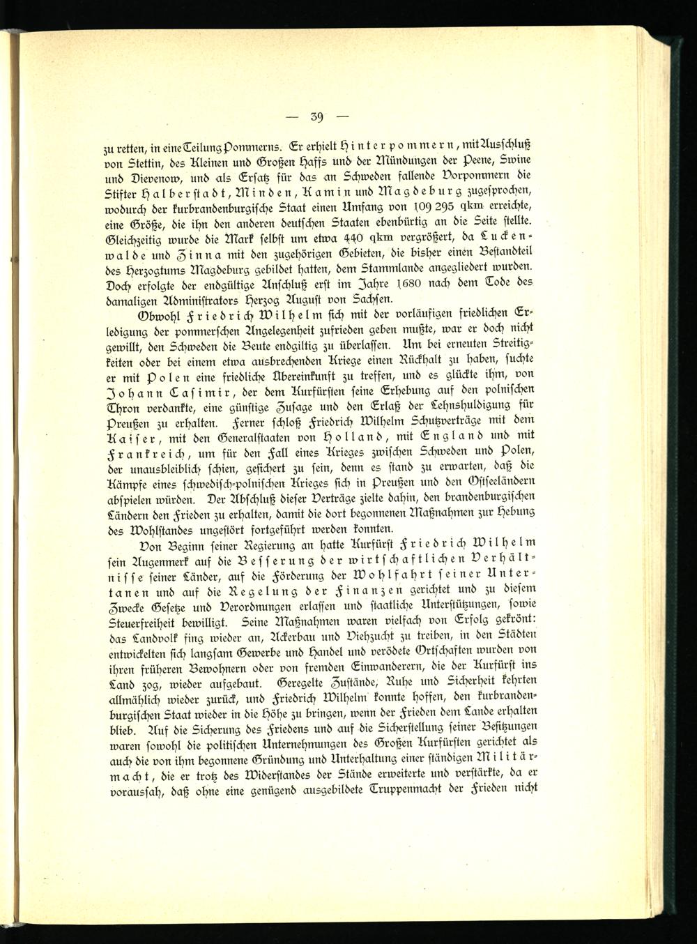 Von Beginn seiner Regierung an hatte Kurfürst Friedrich Wilhelm sein Augenmerk auf die Besserung der wirtschaftlichen Verhältnisse seiner Länder, auf die Förderung der Wohlfahrt seiner Untertanen und auf die Regelung der Finanzen gerichtet und zu diesem Zwecke Gesetze und Verordnungen erlassen und staatliche Unterstützungen, sowie Steuerfreiheit bewilligt. Seine Maßnahmen waren vielfach von Erfolg gekrönt: das Landvolk fing wieder an, Ackerbau und Viehzucht zu treiben, in den Städten entwickelten sich langsam Gewerbe und Handel und verödete Ortschaften wurden von ihren früheren Bewohnern oder von fremden Einwanderern, die der Kurfürst ins Land zog, wieder aufgebaut. Geregelte Zustände, Ruhe und Sicherheit kehrten allmählich wieder zurück, und Friedrich Wilhelm konnte hoffen, den kurbranden- burgischen Staat wieder in die höhe zu bringen, wenn der Frieden dem Lande erhalten blieb. Auf die Sicherung des Friedens und auf die Sicherstellung seiner Besitzungen waren sowohl die politischen Unternehmungen des Großen Kurfürsten gerichtet als auch die von ihm begonnene Gründung und Unterhaltung einer ständigen Militär- macbt, die er trotz des Widerstandes der Stände erweiterte und verstärkte, da er voraussah, daß ohne eine genügend ausgebildete Truppenmacht der Frieden nicht