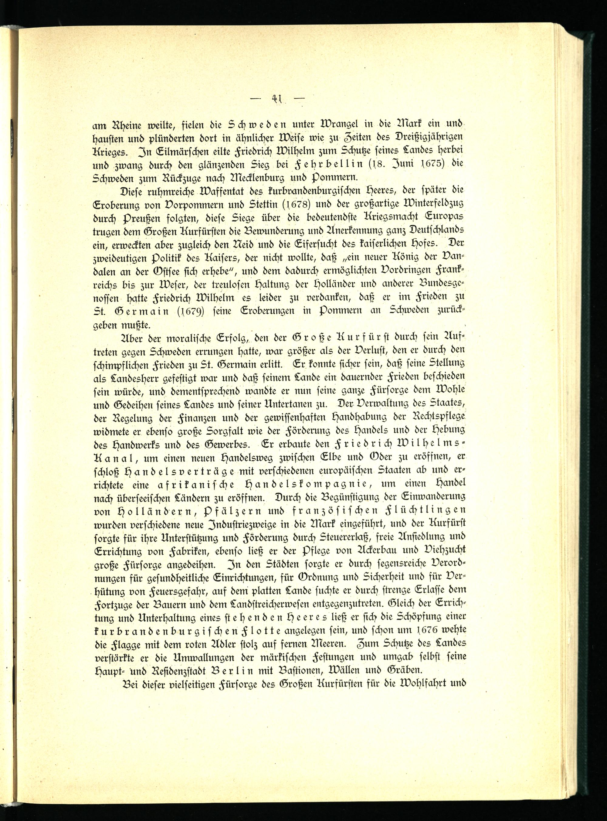 Aber der moralische Erfolg, den der Große Kurfürst durch sein Auftreten gegen Schweden errungen hatte, war größer als der Verlust, den er durch den schimpflichen Frieden zu St. Germain erlitt. Er konnte sicher fein, daß seine Stellung als Landesherr gefestigt war und daß feinem Lande ein dauernder Frieden beschieden sein würde, und dementsprechend wandte er nun seine ganze Fürsorge dem Wöhle und Gedeihen seines Landes und seiner Untertanen zu. Der Verwaltung des Staates, der Regelung der Finanzen und der gewissenhaften Handhabung der Rechtspflege widmete er ebenso große Sorgfalt wie der Förderung des Handels und der Hebung des Handwerks und des Gewerbes. Er erbaute den Friedrich Wilhelms- Kanal, um einen neuen Handelsweg zwischen Elbe und Oder zu eröffnen, er schloß Handelsverträge mit verschiedenen europäischen Staaten ab und errichtete eine afrikanische Handelskompagnie, um einen Handel nach überseeischen Ländern zu eröffnen. Durch die Begünstigung der Einwanderung von Holländern, pfälzern und französischen Flüchtlingen wurden verschiedene neue Industriezweige in die Mark eingeführt, und der Kurfürst sorgte für ihre Unterstützung und Förderung durch Steuererlaß, freie Ansiedlung und Errichtung von Fabriken, ebenso ließ er der pflege von Ackerbau und Viehzucht große Fürsorge angedeihen. In den Städten sorgte er durch segensreiche Verordnungen für gesundheitliche Einrichtungen, für Ordnung und Sicherheit und für Verhütung von Feuersgefahr, aus dem platten Lande suchte er durch strenge Erlasse dem Fortzuge der Bauern und dem Landstreicherwefen entgegenzutreten. Gleich der Errichtung und Unterhaltung eines stehenden Heeres ließ er sich die Schöpfung einer kurbrandenburgischenFlotte angelegen sein, und schon um s676 wehte die Flagge mit dem roten Adler stolz auf fernen Meeren. Zum Schutze des Landes verstärkte er die Umwallungen der märkischen Festungen und umgab selbst seine Haupt- und Residenzstadt Berlin mit Bastionen, Wällen und Gräben.