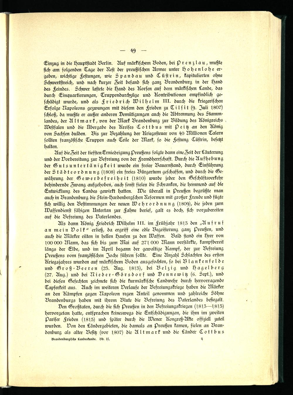 Als dann König Friedrich Wilhelm III. im Frühjahr 1813 den „Aufruf an mein Volk" erließ, da ergriff eine edle Begeisterung ganz Preußen, und auch die Märker eilten in Hellen Haufen zu den Waffen. Bald stand ein Heer von 100 000 Mann, das sich bis zum Mai auf 27 s 000 Mann verstärkte, kampfbereit längs der Elbe, und im April begann der gewaltige Kampf, der zur Befreiung Preußens vom französischen Joche führen sollte. Eine Anzahl Schlachten des ersten Kriegsjahres wurden auf märkischem Boden ausgefochten, so bei Blankenfelde und Groß-Beeren (23. Aug. 1813), bei Bel zig und Hagelberg (27. Aug.) und bei Nieder-Görsdorf und Dennewitz (6. Sept.), und bei diesen Gefechten zeichnete sich die kurmärkische Landwehr durch hervorragende Tapferkeit aus. Auch im weiteren Verlaufe der Befreiungskriege haben die Märker an den Kämpfen gegen Napoleon regen Anteil genommen und zahlreiche Söhne Brandenburgs haben mit ihrem Blute die Befreiung des Vaterlandes besiegelt.