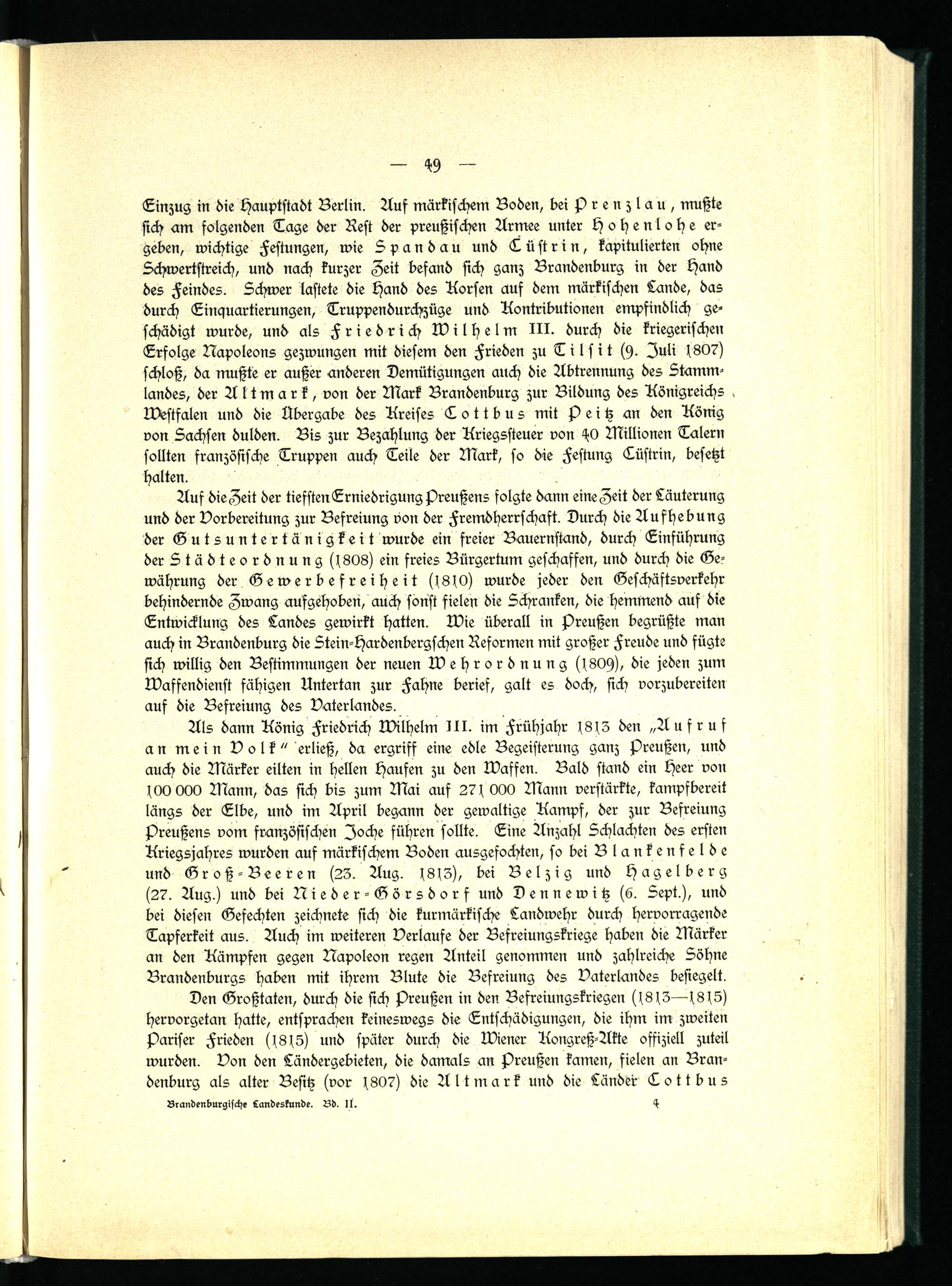 Auf die Zeit der tiefsten Erniedrigung Preußens folgte dann eine Zeit der Läuterung und der Vorbereitung zur Befreiung von der Fremdherrschaft. Durch die Aufhebung der Gutsuntertänigkeit wurde ein freier Bauernstand, durch Einführung der Städteordnung (1808) ein freies Bürgertum geschaffen, und durch die Gewährung der Gewerbefreiheit (1810) wurde jeder den Geschäftsverkehr behindernde Zwang aufgehoben, auch sonst fielen die Schranken, die hemmend auf die Entwicklung des Landes gewirkt hatten. Wie überall in Preußen begrüßte man auch in Brandenburg die Stein-Hardenbergschen Reformen mit großer Freude und fügte sich willig den Bestimmungen der neuen Wehrordnung (1809), die jeden zum Waffendienst fähigen Untertan zur Fahne berief, galt es doch, sich vorzubereiten aus die Befreiung des Vaterlandes.
