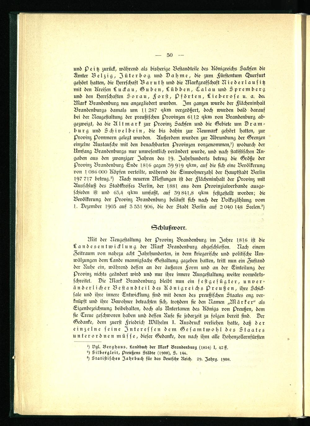 Mit der Neugestaltung der Provinz Brandenburg im Jahre 1816 ist die Landesentwicklung der Mark Brandenburg abgeschlossen. Nach einem Zeitraum von nahezu acht Jahrhunderten, in dem kriegerische und politische Umwälzungen dem Lande mannigfache Gestaltung gegeben hatten, tritt nun ein Zustand der Ruhe ein, während dessen an der äußeren Form und an der Einteilung der Provinz nichts geändert wird und nur ihre innere Ausgestaltung weiter vorwärtsschreitet. Die Mark Brandenburg bleibt nun ein festgefügter, unveränderlicher Bestandteil des Königreichs Preußen, ihre Lchick- sale und ihre innere Entwicklung sind mit denen des preußischen Ltaates eng verknüpft und ihre Bewohner betrachten sich, trotzdem sie den Namen „Märker" als Eigenbezeichnung beibehalten, doch als Untertanen des Königs von Preußen, dem sie Treue geschworen haben und dessen Rufe sie jederzeit zu folgen bereit sind. Der Gedanke, dem zuerst Friedrich Wilhelm I. Ausdruck verliehen hatte, daß der einzelne seine Interessen dem Gesamtwohl des Ltaates unterordnen müsse, dieser Gedanke, den nach ihm alle Hohenzollernfürsten