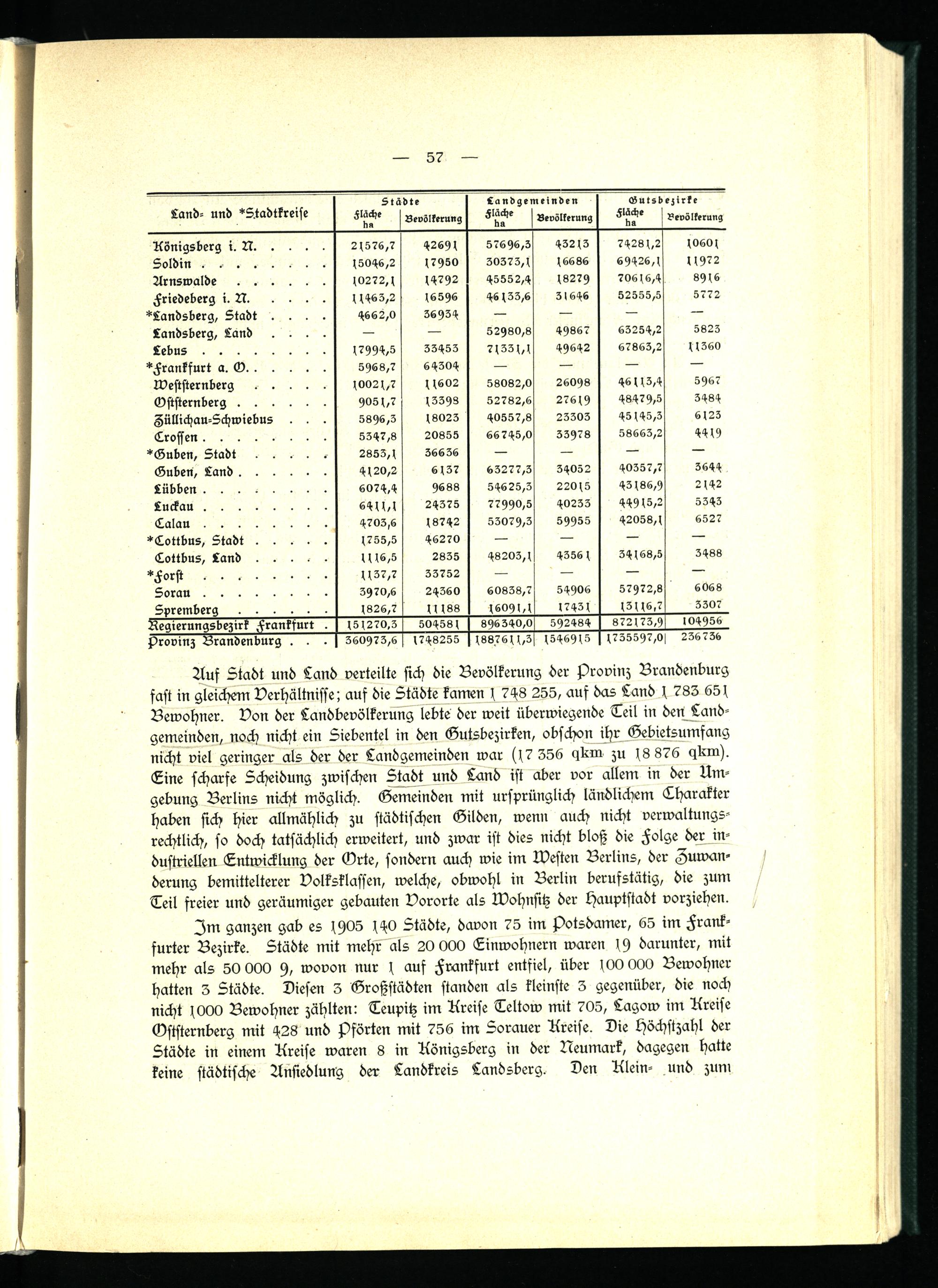 Im ganzen gab es 1905 140 S tädte, davon 7 5 i m Potsdamer, 6 5 i m Frankfurter Bezirke. Städte mit mehr als 20 000 Einwohnern waren ssi darunter, mit mehr als 50 000 9, wovon nur 1 auf Frankfurt entfiel, über 100 000 Bewohner hatten 3 Städte. Diesen 3 Großstädten standen als kleinste 3 gegenüber, die noch nicht 1OOO Bewohner zählten: Teupitz im Kreise Teltow mit 705, Lagow im Kreise Oststernberg mit 428 und Pförten mit 756 im Sorauer Kreise. Die Höchstzahl der Städte in einem Kreise waren 8 in Königsberg in der Neumark, dagegen hatte keine städtische Ansiedlung der Landkreis Landsberg. Den Klein- und zum