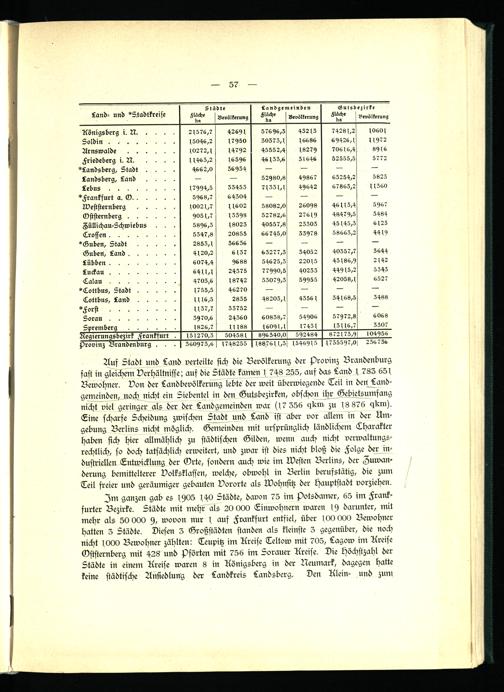 Auf Stadt und Land verteilte sich die Bevölkerung der Provinz Brandenburg fast in gleichem Verhältnisse; auf die Städte kamen 1 1 748 255, auf das Land 1 783 65 Bewohner. Von der Landbevölkerung lebte der weit überwiegende Teil in den Landgemeinden, noch nicht ein Siebentel in den Gutsbezirken, obsch on ihr G ebiets umfang nicht viel geringer als der der Landgemeinden war . (1 7 356 qkm zu 18 876 qkm) Eine scharfe Scheidung zwischen Stadt und Land ist aber vor allem in der Umgebung Berlins nicht möglich. Gemeinden mit ursprünglich ländlichem Charakter haben sich hier allmählich zu städtischen Gilden, wenn auch nicht verwaltungs- rechtlich, so doch tatsächlich erweitert, und zwar ist dies nicht bloß die Folge der industriellen Entwicklung der Orte, sondern auch wie im Westen Berlins, der Zuwanderung bemittelterer Volksklassen, welche, obwohl in Berlin berufstätig, die zum Teil freier und geräumiger gebauten Vororte als Wohnsitz der Hauptstadt vorziehen.