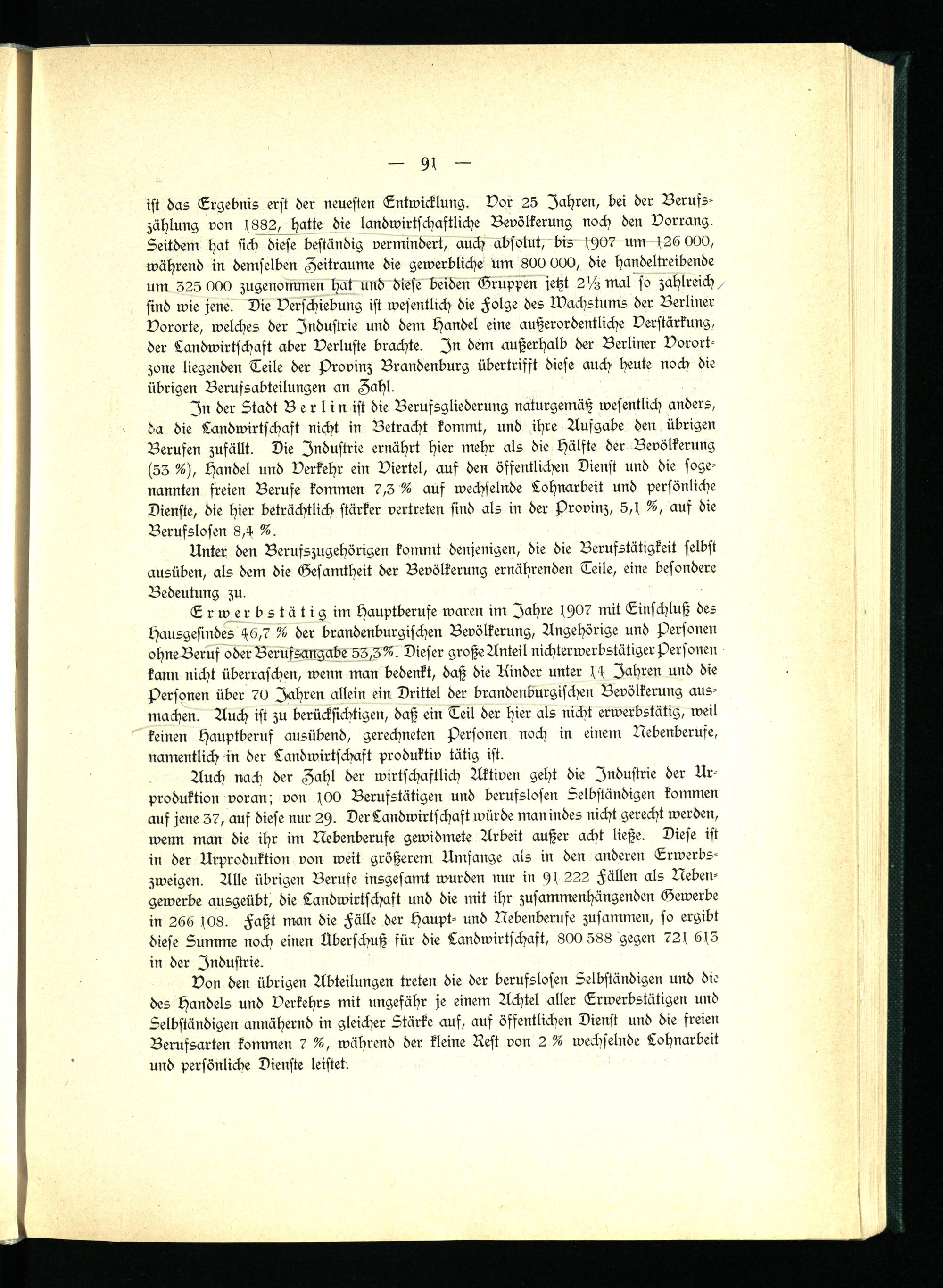 ist das Ergebnis erst der neuesten Entwicklung. Vor 25 Jahren, bei der Berufszählung von >882, hatte die landwirtschaftliche Bevölkerung noch den Vorrang. Seitdem hat sich diese beständig vermindert, auch absolut, bis >907 um >26000, während in demselben Zeiträume die gewerbliche um 800 000, die handeltreibende um 325 000 zugenommen hat und diese beiden Gruppen jetzt schmal so zahlreich sind wie jene. Die Verschiebung ist wesentlich die Holge des Wachstums der Berliner- Vororte, welches der Industrie und dem Handel eine außerordentliche Verstärkung, der Landwirtschaft aber Verluste brachte. In dem außerhalb der Berliner Vorortzone liegenden Teile der Provinz Brandenburg übertrifft diese auch heute noch die übrigen Berufsabteilungen an Zahl.