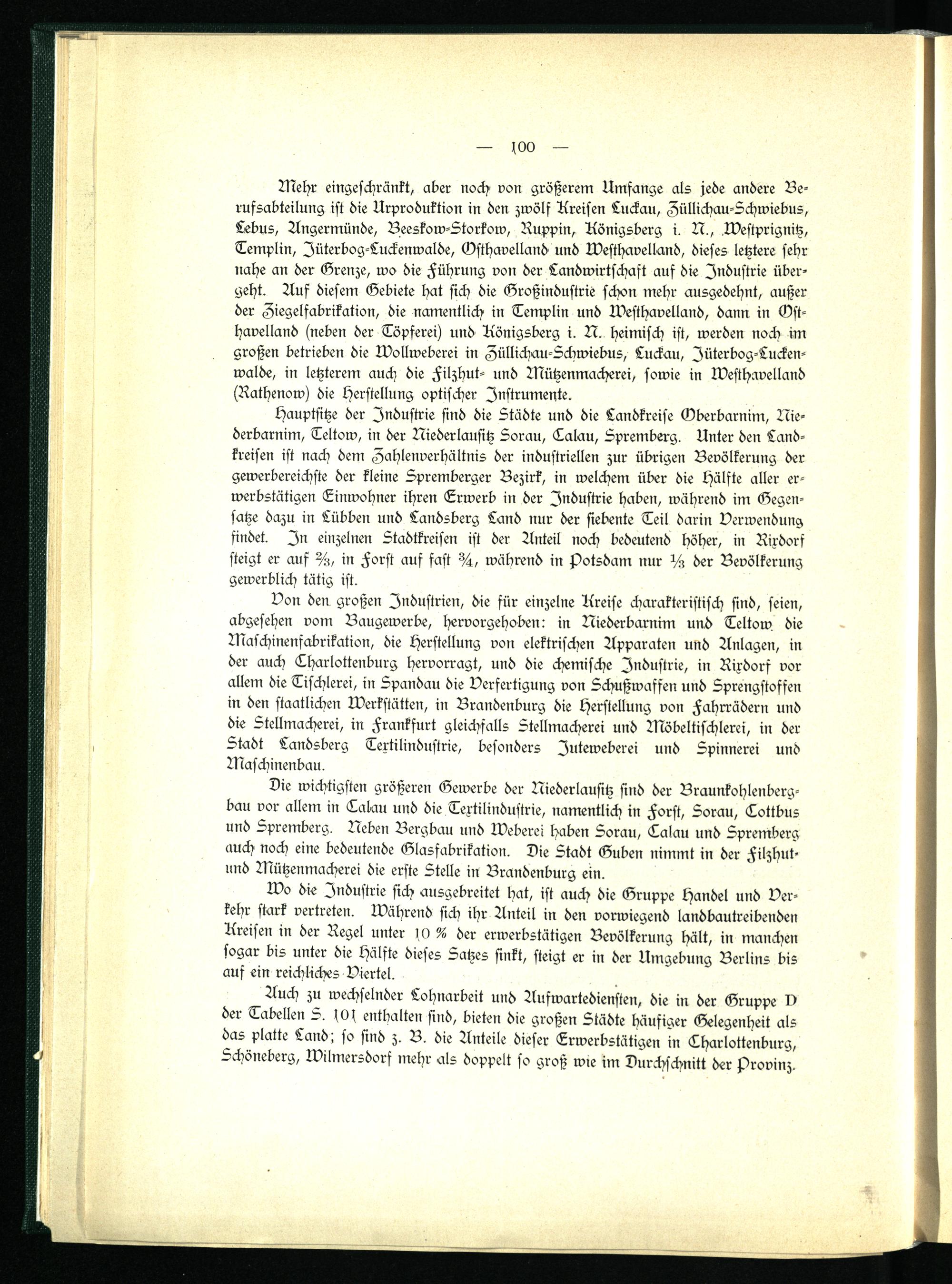 Hauptsitze der Industrie sind die Städte und die Landkreise Oberbarnim, Niederbarnim, Teltow, in der Niederlausitz Sorau, Calau, Spremberg. Unter den Landkreisen ist nach dem Aahlenverhältnis der industriellen zur übrigen Bevölkerung der gewerbereichste der kleine Spremberger Bezirk, in welchem über die Hälfte aller erwerbstätigen Einwohner ihren Erwerb in der Industrie haben, während im Gegensätze dazu in Lübben und Landsberg Land nur der siebente Teil darin Verwendung findet. In einzelnen Stadtkreisen ist der Anteil noch bedeutend höher, in Rixdors steigt er aus hch in Forst auf fast 3/4 ist, während in Potsdam nur Hst der Bevölkerung gewerblich tätig ist.