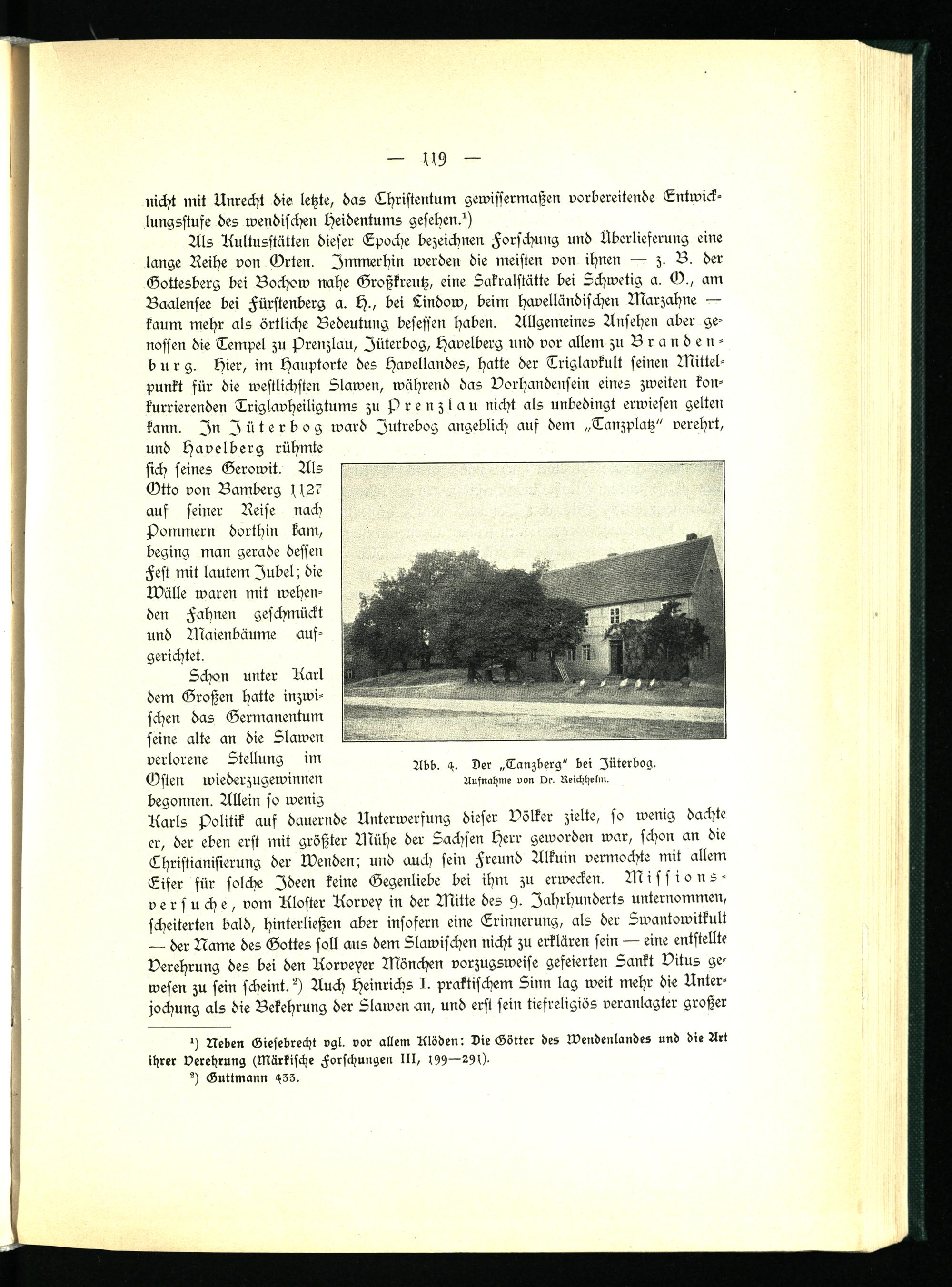 Als Kultusstätten dieser Epoche bezeichnen Forschung und Überlieferung eine lange Reihe von Orten. Immerhin werden die meisten von ihnen — z. B. der Gottesberg bei Bochow nahe Großkreutz, eine Sakralstätte bei Schwetig a. O., am Baalensee bei Fürstenberg a. h., bei Lindow, beim havelländischen Marzahne — kaum mehr als örtliche Bedeutung besessen haben. Allgemeines Ansehen aber genossen die Tempel zu Prenzlau, Jüterbog, havelberg und vor allem zu Brandenburg. hier, im hauptorte des Havellandes, hatte der Triglavkult seinen Mittelpunkt für die westlichsten Slawen, während das Vorhandensein eines zweiten konkurrierenden Triglavheiligtums zu Prenzlau nicht als unbedingt erwiesen gelten kann. In Jüterbog ward Jutrebog angeblich auf dem „Tanzplatz" verehrt, und havelberg rühmte sich seines Gerowit. Als Otto von Bamberg 1127 auf seiner Reise nach Pommern dorthin kam, beging man gerade dessen Fest mit lautem Jubel ; die Wälle waren mit wehenden Fahnen geschmückt und Maienbäume aufgerichtet.