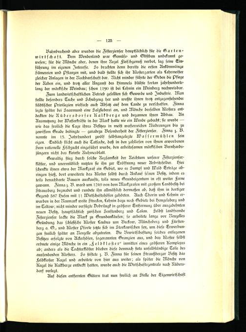 Bahnbrechend aber wurden die Zisterzienser hauptsächlich für die Gartenwirtschaft. Dem Wendenland war Gemüse- und Obstbau unbekannt gewesen; für die Mönche aber, denen ihre Regel Fleischgenuß verbot, lag seine Einführung im eigenen Interesse. So brachten denn bereits die ersten Ankömmlinge Sämereien und Pflanzen mit, und bald stellte sich ihr Klostergarten als Lehrmeister gleicher Anlagen in der Nachbarschaft dar. Nicht minder führte der Orden die pflege der Reben ein, und trotz aller Ungunst des Himmels blühte fortan jahrhundertelang der märkisch Weinbau; schon s sstO ist bei Lehnin ein Weinberg nachweisbar.