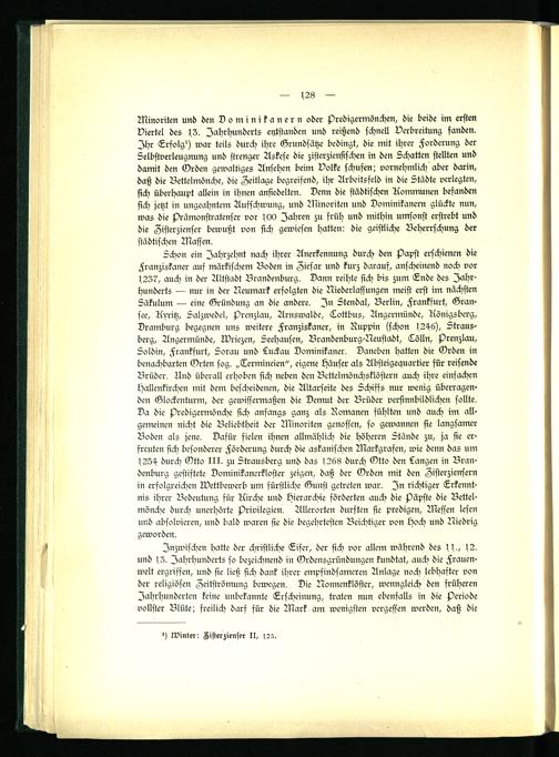 Schon ein Jahrzehnt nach ihrer Anerkennung durch den Papst erschienen die Franziskaner auf märkischem Boden in Ziesar und kurz darauf, anscheinend noch vor 1237, auch in der Altstadt Brandenburg. Dann reihte sich bis zum Ende des Jahrhunderts — nur in der Neumark erfolgten die Niederlassungen meist erst im nächsten Säkulum — eine Gründung an die andere. In Stendal, Berlin, Frankfurt, Gransee, Ayritz, Salzwedel, Prenzlau, Arnswalde, Cottbus, Angermünde, Königsberg, Dramburg begegnen uns weitere Franziskaner, in Ruppin (schon 124-6), Strausberg, Angermünde, Wriezen, Seehausen, Brandenburg-Neustadt, Cölln, Prenzlau, Soldin, Frankfurt, Sorau und Luckau Dominikaner. Daneben hatten die Orden in benachbarten Orten sog. „Termineien", eigene Häuser als Absteigequartier für reisende Brüder. Und überall erhoben sich neben den Bettelmönchsklöstern auch ihre einfachen Hallenkirchen mit dem bescheidenen, die Altarseite des Schiffs nur wenig überragenden Glockenturm, der gewissermaßen die Demut der Brüder versinnbildlichen sollte. Da die Predigermönche sich anfangs ganz als Romanen fühlten und auch im allgemeinen nicht die Beliebtheit der Minoriten genossen, so gewannen sie langsamer Boden als jene. Dafür fielen ihnen allmählich die höheren Stände zu, ja sie erfreuten sich besonderer Förderung durch die askanischen Markgrafen, wie denn das um 125-1 durch Otto III. zu Strausberg und das 1268 durch Otto den Langen in Brandenburg gestiftete Dominikanerkloster zeigen, daß der Orden mit den Zisterziensern in erfolgreichen Wettbewerb um fürstliche Gunst getreten war. In richtiger Erkenntnis ihrer Bedeutung für Kirche und Hierarchie förderten auch die Päpste die Bettelmönche durch unerhörte Privilegien. Allerorten durften sie predigen, Messen lesen und absolvieren, und bald waren sie die begehrtesten Beichtiger von Hoch und Niedrig geworden.