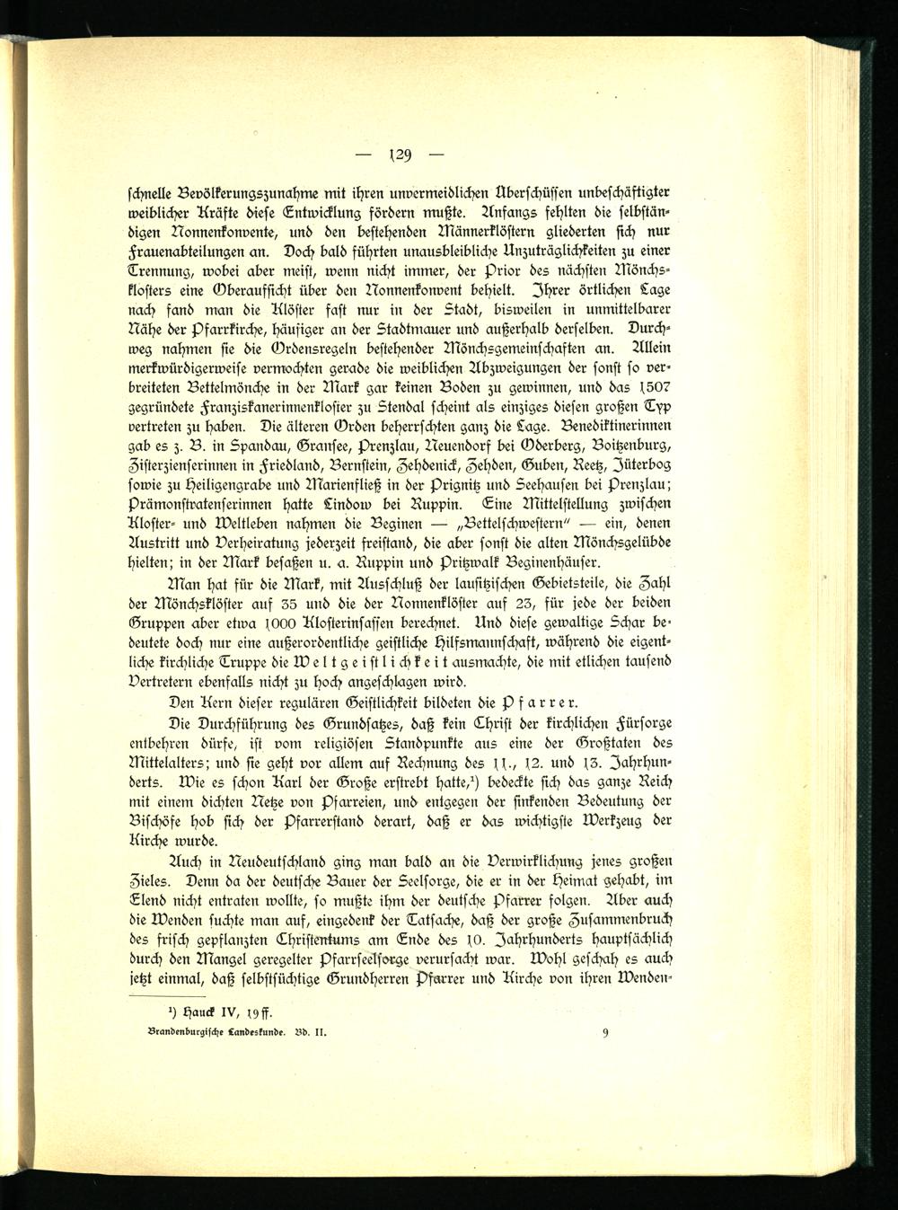 Man hat für die Mark, mit Ausschluß der lausitzischen Gebietsteile, die Zahl der Mönchsklöster auf 35 und die der Nonnenklöster auf 23 , für jede der beiden Gruppen aber etwa 1000 Alosterinsassen berechnet. Und diese gewaltige Schar bedeutete doch nur eine außerordentliche geistliche Hilfsmannschaft, während die eigentliche kirchliche Truppe die Weltgeistlichkeit ausmachte, die mit etlichen tausend Vertretern ebenfalls nicht zu hoch angeschlagen wird.