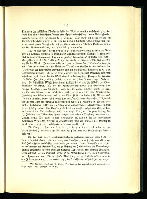 Einlenken der geistlichen Oberhirten hätte die Mark vermutlich noch heute gleich der englischen oder schwedischen Kirche eine Episkopalverfassung: deren Unbeugsamkeit bewirkte nun aber die Preisgabe dieses Prinzips. Auch Kurbrandenburg bekam sein staatliches Kirchenregiment so gut wie die übrigen deutschen Landeskirchen und entfernte damit einen Grenzscheid zwischen ihnen und dem märkischen Protestantismus, der der Gesamtentwicklung nur hinderlich gewesen wäre.