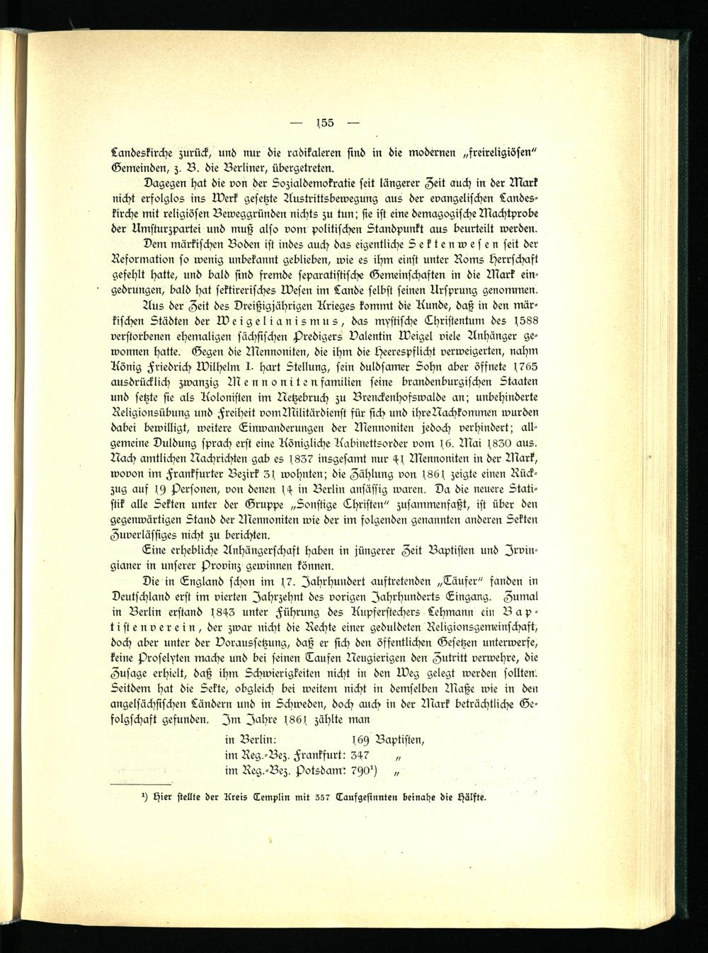 Die in England schon im 1(7. Jahrhundert auftretenden „Täufer" fanden in Deutschland erst im vierten Jahrzehnt des vorigen Jahrhunderts Eingang. Zumal in Berlin erstand (843 unter Führung des Kupferstechers Lehmann ein Baptist e n v e r e i n , der zwar nicht die Rechte einer geduldeten Religionsgemeinschaft, doch aber unter der Voraussetzung, daß er sich den öffentlichen Gesetzen unterwerfe, keine proselyten mache und bei seinen Taufen Neugierigen den Zutritt verwehre, die Zusage erhielt, daß ihm Schwierigkeiten nicht in den Weg gelegt werden sollten. Seitdem hat die Sekte, obgleich bei weitem nicht in demselben Maße wie in den angelsächsischen Ländern und in Schweden, doch auch in der Mark beträchtliche Gefolgschaft gefunden. Zm Jahre ( 861 . zählte man