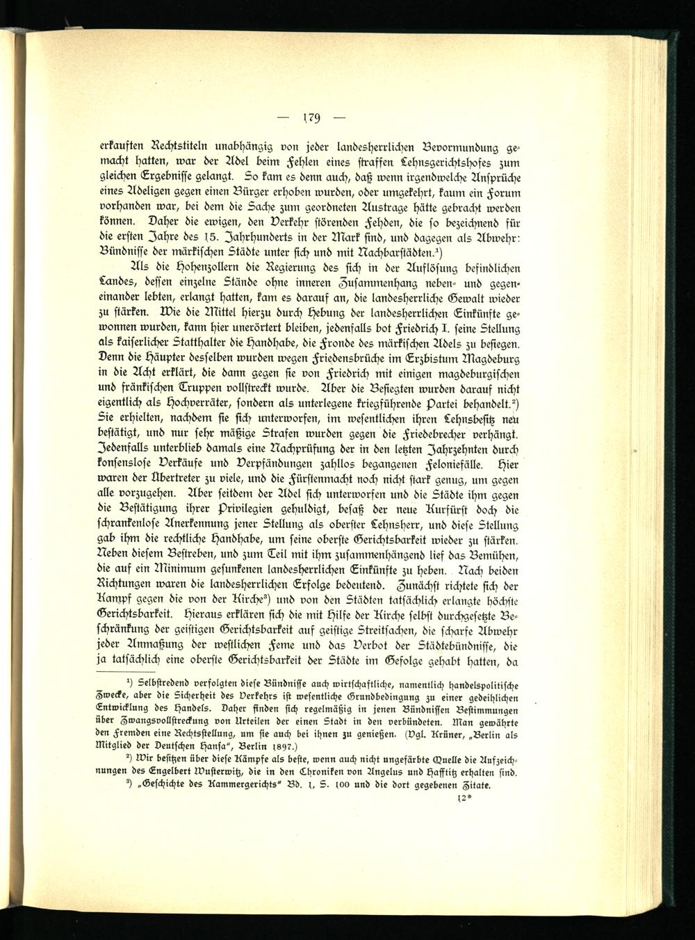 erkauften Rechtstiteln unabhängig von jeder landesherrlichen Bevormundung gemacht hatten, war der Abel beim Fehlen eines straffen Lehnsgerichtshofes zum gleichen Ergebnisse gelangt. So kam es denn auch, daß wenn irgendwelche Ansprüche eines Adeligen gegen einen Bürger erhoben wurden, oder umgekehrt, kaum ein Forum vorhanden war, bei dem die Sache zum geordneten Austrage hätte gebracht werden können. Daher die ewigen, den Verkehr störenden Fehden, die so bezeichnend für die ersten Jahre des s5. Jahrhunderts in der Mark sind, und dagegen als Abwehr: Bündnisse der märkischen Städte unter sich und mit Nachbarstädten?)
