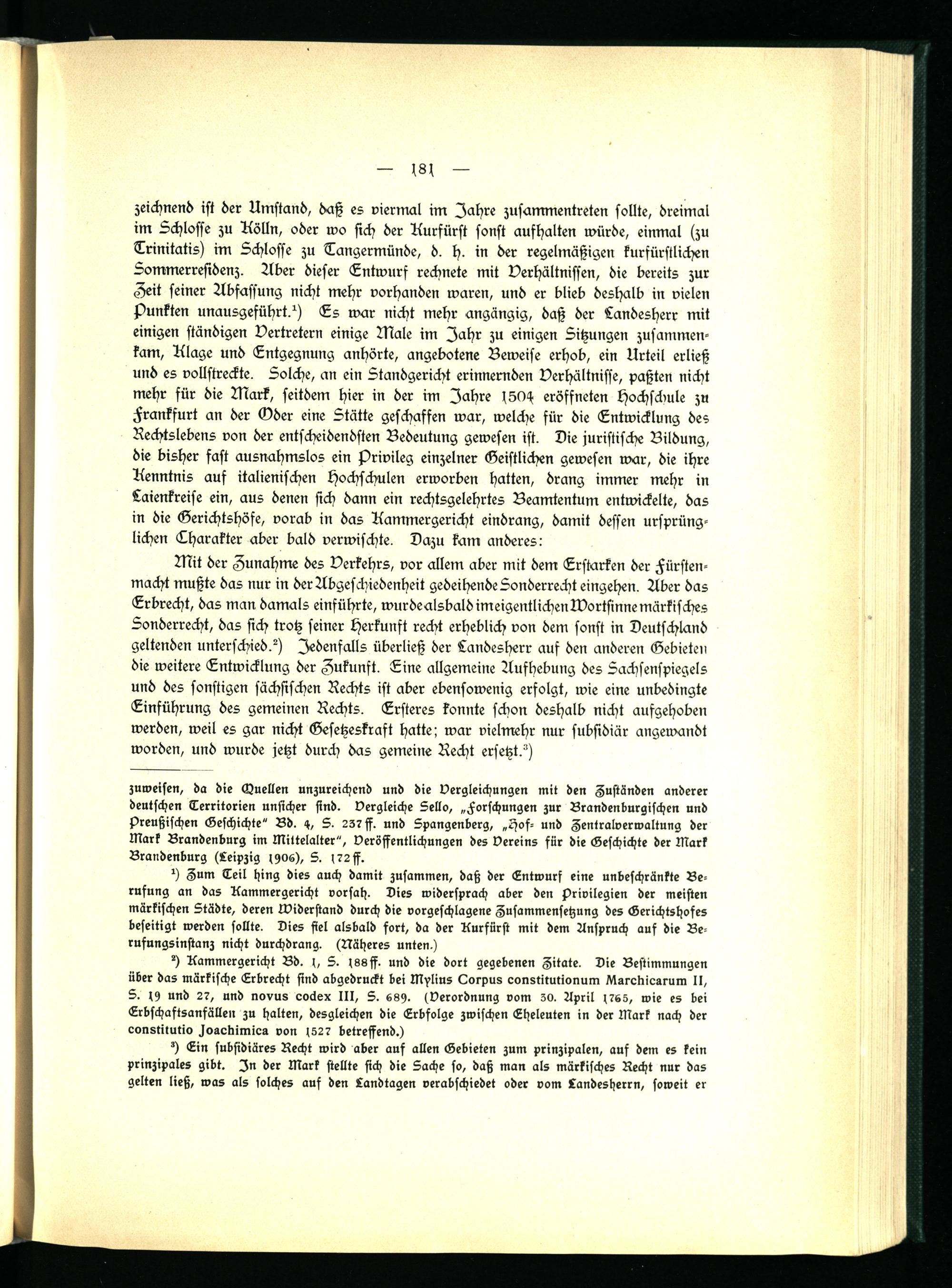Mit der Zunahme des Verkehrs, vor allem aber mit dem Erstarken der Fürstenmacht mußte das nur in der Abgeschiedenheit gedeihende Sonderrecht eingehen. Aber das Erbrecht, das man damals einführte, wurde alsbald im eigentlichen Wortsinne märkischer Sonderrecht, das sich trotz seiner Herkunft recht erheblich von dem sonst in Deutschland geltenden unterschied?) Jedenfalls überließ der Landesherr auf den anderen Gebieten die weitere Entwicklung der Zukunft. Eine allgemeine Aufhebung des Sachsenspiegels und des sonstigen sächsischen Rechts ist aber ebensowenig erfolgt, wie eine unbedingte Einführung des gemeinen Rechts. Ersteres konnte schon deshalb nicht aufgehoben werden, weil es gar nicht Gesetzeskraft hatte; war vielmehr nur subsidiär angewandt worden, und wurde jetzt durch das gemeine Recht ersetzt?)