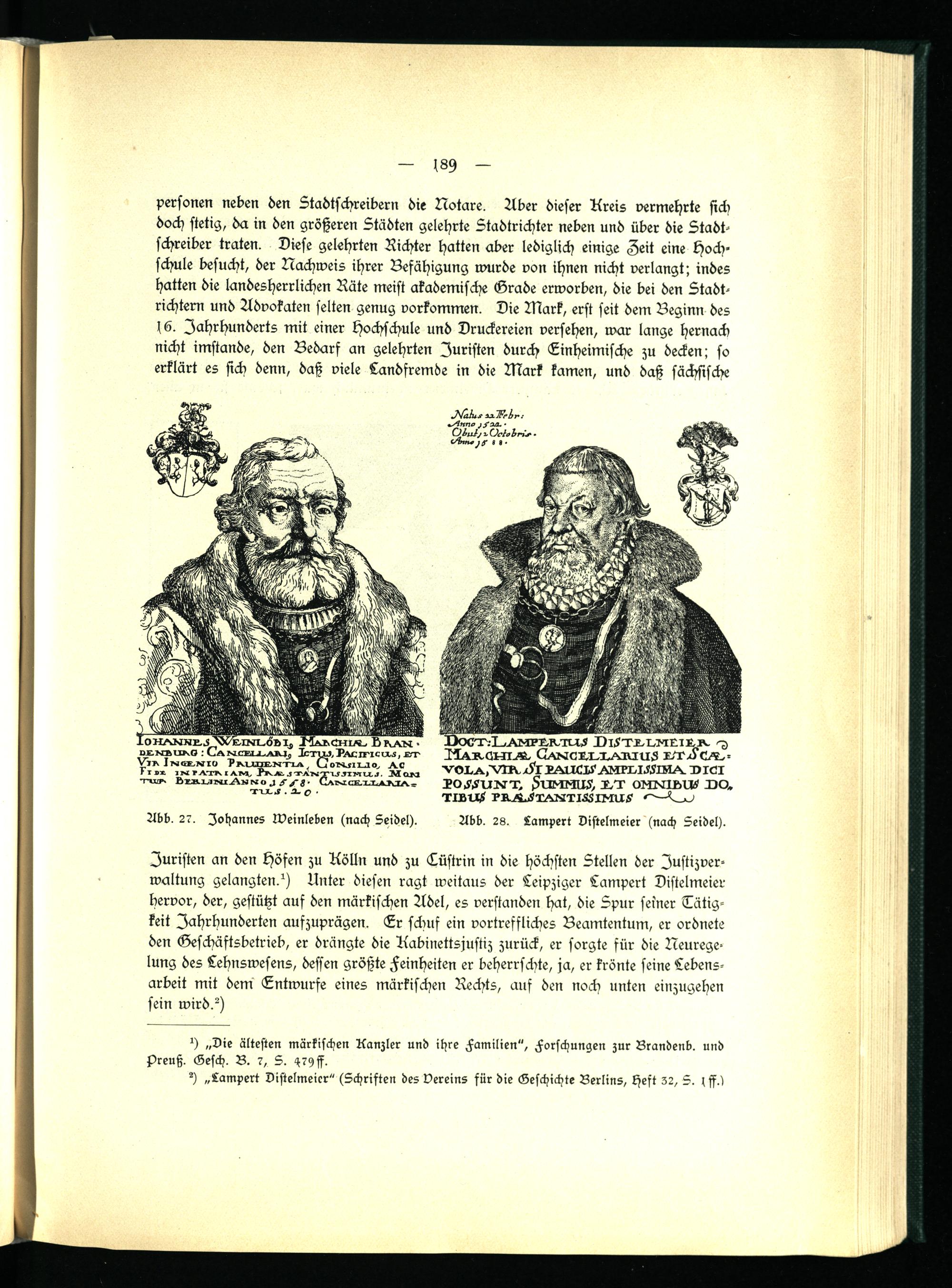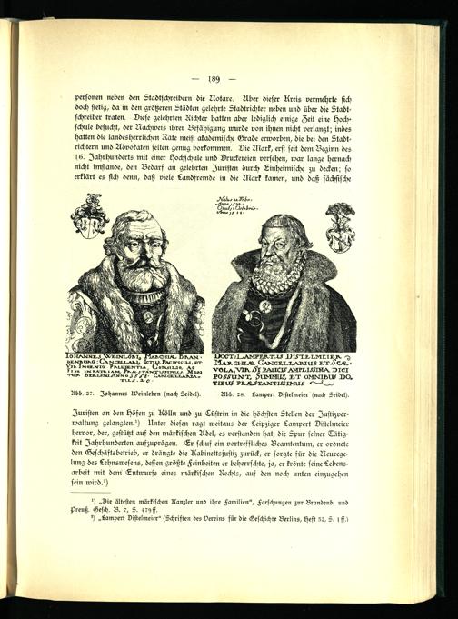 Personen neben den Stadtschreibern die Notare. Aber dieser Ureis vermehrte sich doch stetig, da in den größeren Städten gelehrte Stadtrichter neben und über die Stadt- schreiber traten. Diese gelehrten Richter hatten aber lediglich einige Zeit eine Hochschule besucht, der Nachweis ihrer Befähigung wurde von ihnen nicht verlangt; indes hatten die landesherrlichen Räte meist akademische Grade erworben, die bei den Stadtrichtern und Advokaten selten genug Vorkommen. Die Mark, erst seit dem Beginn des 16 . Jahrhunderts mit einer Hochschule und Druckereien versehen, war lange hernach nicht imstande, den Bedarf an gelehrten Juristen durch Einheimische zu decken; so erklärt es sich denn, daß viele Landfremde in die Mark kamen, und daß sächsische