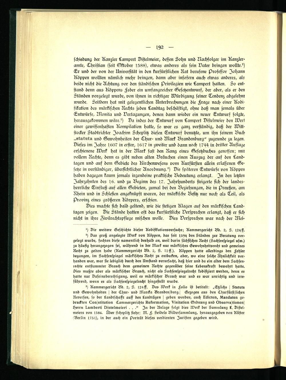 schiedung der Kanzler Lampert Distelmeier, dessen Lohn und Nachfolger im Kanzler- amte, Christian (seit (Oktober ( 588 ), etwas anderes als sein Vater bringen wollte?) Cr und der von der Universität in den kurfürstlichen Rat berufene Professor Johann Köppen wollten nämlich mehr bringen, dann aber insofern auch etwas anderes, als beide nicht die Achtung vor den ständischen Privilegien wie Lampert hatten. So entstand denn aus Köppens Feder ein umfangreicher Gesetzentwurf, der aber, als er den Ständen vorgelegt wurde, von ihnen in richtiger Würdigung seiner Tendenz abgelehni wurde. Seitdem hat mit gelegentlichen Unterbrechungen die Frage nach einer Kodifikation des märkischen Rechts jeden Landtag beschäftigt, ohne daß man jemals über Entwürfe, Monita und Vertagungen, denen dann wieder ein neuer Entwurf folgte, herausgekommen wäre?) Da indes der Entwurf von Lampert Distelmeier den Wert einer gewissenhaften Kompilation hatte, so war es ganz verständig, daß der Witt- stocker Stadtrichter Joachim Scheplitz diesen Entwurf benutzte, um ihn seinem Buch „statuta und Gewohnheiten der Thur- und Mark Brandenburg" zugrunde zu legen. Dieses im Jahre (607 in erster, 1617 in zweiter und dann noch 1744 in dritter Auflage erschienene Werk hat in der Mark fast den Rang eines Gesetzbuches genossen; mii vollem Rechte, denn es gibt neben alten Bräuchen einen Auszug der auf den Landtagen und auf dem Gebiete des Kirchenwesens vom Kurfürsten allein erlassenen Gesetze in verständiger, übersichtlicher Anordnung?) Die späteren Entwürfe von Koppen haben dagegen kaum jemals irgendeine praktische Bedeutung erlangt. In den letzten Jahrzehnten des ( 6 . und zu Beginn des 17 . Jahrhunderts steigerte sich der landesherrliche Einfluß auf allen Gebieten, zumal bei den Beziehungen, die in Preußen, am Rhein und in Schlesien angeknüpst waren, der märkische Besitz nur noch als Teil, als Provinz eines größeren Körpers, erschien.