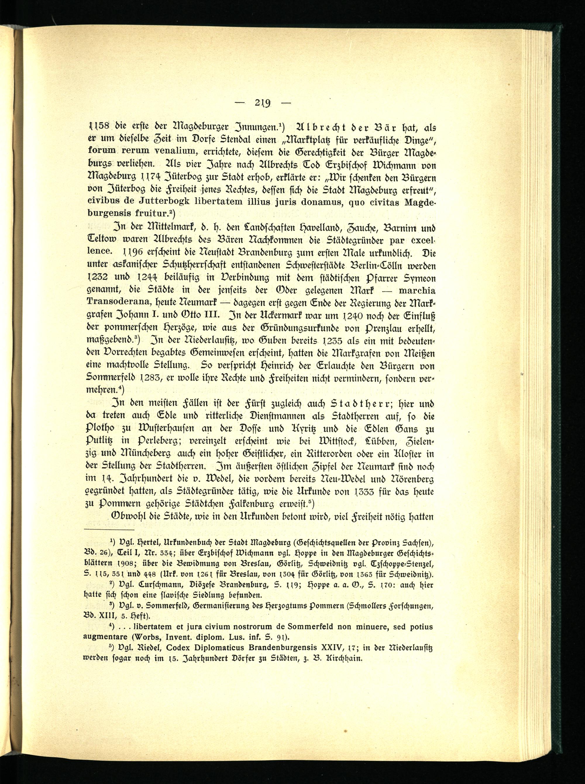 ((58 die erste der Magdeburger Innungen?) Albrecht der Bär hat, als er um dieselbe Zeit im Dorfe Stendal einen „Marktplatz für verkäufliche Dinge", korum verum veuulium, errichtete, diesem die Gerechtigkeit der Bürger Magdeburgs verliehen. Als vier Jahre nach Albrechts Tod Erzbischof Wichmann von Magdeburg ((7H Jüterbog zur Stadt erhob, erklärte er: „Wir schenken den Bürgern von Jüterbog die Freiheit jenes Rechtes, dessen sich die Stadt Magdeburg erfreut", dvidus äs äuttsrboKle lidedutem illlus juris äous-mus, c>uo dvitas Nuxäe- buvAkusis kruitur?)