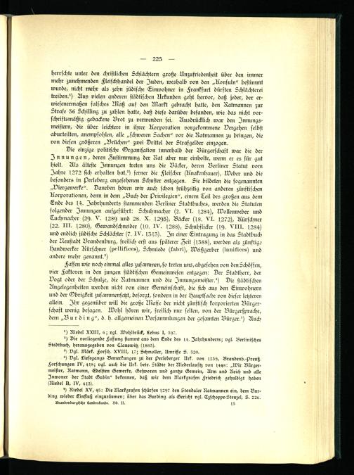 Die einzige politische Organisation innerhalb der Bürgerschaft war die der Innungen, deren Zustimmung der Rat aber nur einholte, wenn er es für gut hielt. Als älteste Innungen treten uns die Bäcker, deren Berliner Statut vom Jahre (272 sich erhalten hat?) ferner die Fleischer (Knakcnhauer), Weber und die besonders in perleberg angesehenen Schuster entgegen. Sie bildeten die sogenannten „Viergewerke". Daneben hören wir auch schon frühzeitig von anderen zünftischen Korporationen, denn in dem „Buch der Privilegien", einem Teil des großen aus dem Ende des (4. Jahrhunderts stammenden Berliner Stadtbuches, werden die Statuten folgender Innungen aufgeführt: Schuhmacher (2. VI- >284), Wollenweber und Tuchmacher (29. V. (289 und 28. X. (295), Bäcker ((8. VI. (272), Kürschner (22. III- (280), Gewandschneider ((0. IV. (288), Schuhflicker ((9. VIII. 4284) und endlich jüdische Schlächter (7. IV. (Z ( 3) . In einer Eintragung in das Stadtbuch der Neustadt Brandenburg, freilich erst aus späterer Zeit ((388), werden als zünftige Handwerker Kürschner (polliklevs), Schmiede (lubri), Weißgerber (lunikleo«) und andere mehr genannt?)