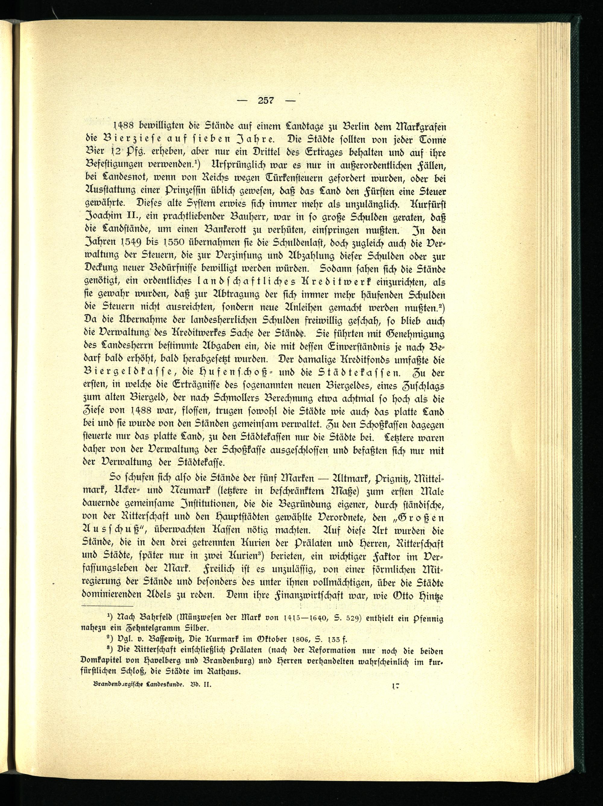 (488 bewilligten die Stände auf einem Landtage zu Berlin dem Markgrafen die Bierziese auf sieben Jahre. Die Städte sollten von jeder Tonne Bier (2 pfg. erheben, aber nur ein Drittel des Ertrages behalten und auf ihre Befestigungen verwenden?) Ursprünglich war es nur in außerordentlichen Fällen, bei Landesnot, wenn von Reichs wegen Türkenfteuern gefordert wurden, oder bei Ausstattung einer Prinzessin üblich gewesen, daß das Land den Fürsten eine Steuer gewährte. Dieses alte System erwies sich immer mehr als unzulänglich. Kurfürst Joachim II., ein prachtliebender Bauherr, war in so große Schulden geraten, daß die Landstände, um einen Bankerott zu verhüten, einspringen mußten. In den Jahren (5^9 bis 1 550 übernahmen sie die Schuldenlast, doch zugleich auch die Verwaltung der Steuern, die zur Verzinsung und Abzahlung dieser Schulden oder zur Deckung neuer Bedürfnisse bewilligt werden würden. Sodann sahen sich die Stände genötigt, ein ordentliches landschaftliches Kreditwerk einzurichten, als sie gewahr wurden, daß zur Abtragung der sich immer mehr häufenden Schulden die Steuern nicht ausreichten, sondern neue Anleihen gemacht werden mußten?) Da die Übernahme der landesherrlichen Schulden freiwillig geschah, so blieb auch die Verwaltung des Kreditwerkes Sache der Stände. Sie führten mit Genehmigung des Landesherrn bestimmte Abgaben ein, die mit dessen Einverständnis je nach Bedarf bald erhöht, bald herabgesetzt wurden. Der damalige Kreditfonds umfaßte die Biergeldkasse, die Hufensichoß - die Städtekassen. Zu der ersten, in welche die Erträgnisse des sogenannten neuen Biergeldes, eines Zuschlags zum alten Biergeld, der nach Schmollers Berechnung etwa achtmal so hoch als die Ziese von sH88 war, flössen, trugen sowohl die Städte wie auch das platte Land bei und sie wurde von den Ständen gemeinsam verwaltet. Zu den Schoßkassen dagegen steuerte nur das platte Land, zu den Städtekassen nur die Städte bei. Letztere waren daher von der Verwaltung der Schoßkasse ausgeschlossen und befaßten sich nur mit der Verwaltung der Städtekasse.