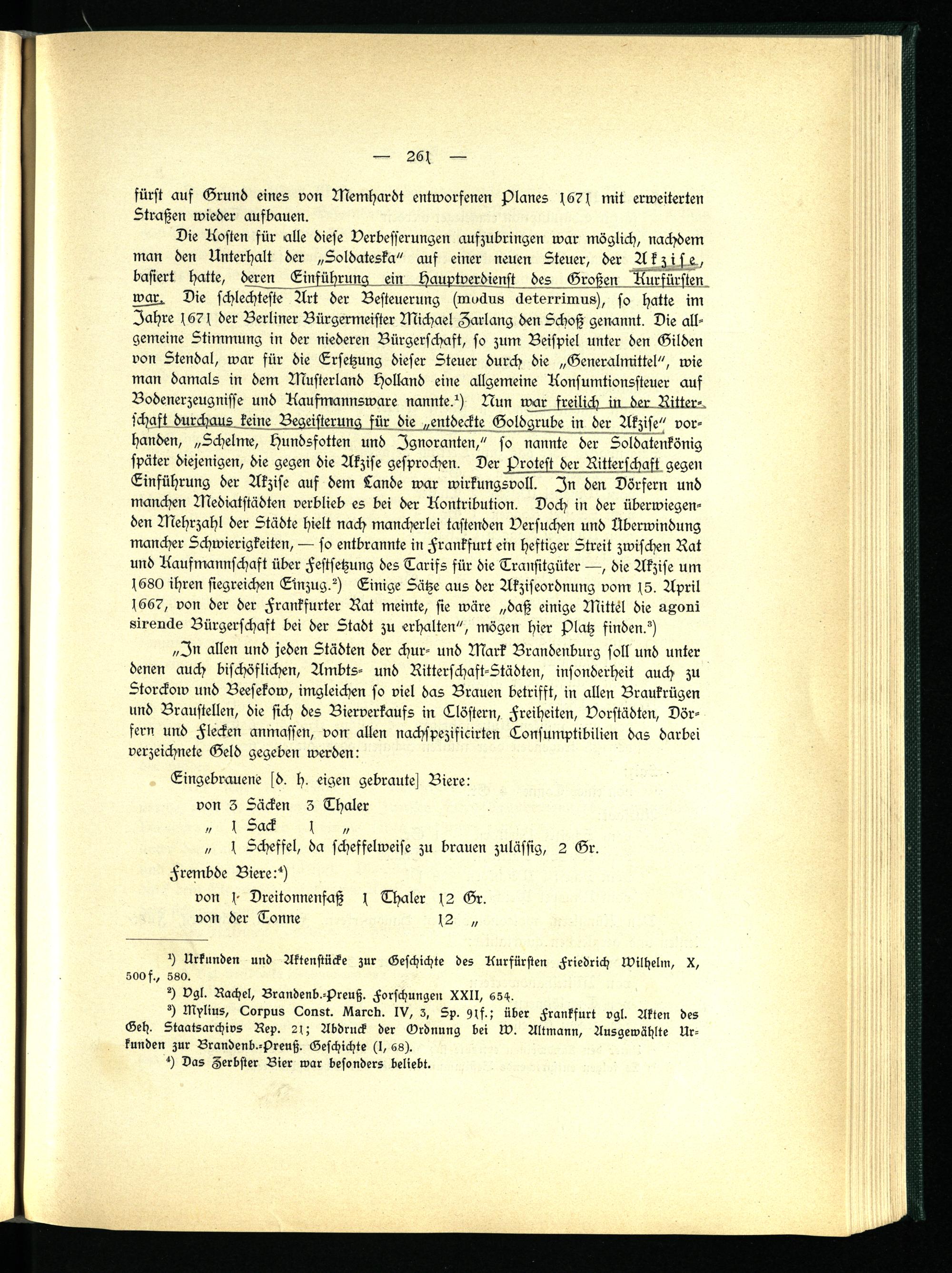 „In allen und jeden Städten der chur- und Mark Brandenburg soll und unter denen auch bischöflichen, Ambts- und Ritterschaft-Städten, insonderheit auch zu Storckow und Beesekow, imgleichen so viel das Brauen betrifft, in allen Braukrügen und Braustellen, die sich des Bierverkaufs in Tlöstern, Freiheiten, Vorstädten, Dörfern und Flecken anmassen, von allen nachspezificirten Tonsumptibilien das darbei verzeichnete Geld gegeben werden: