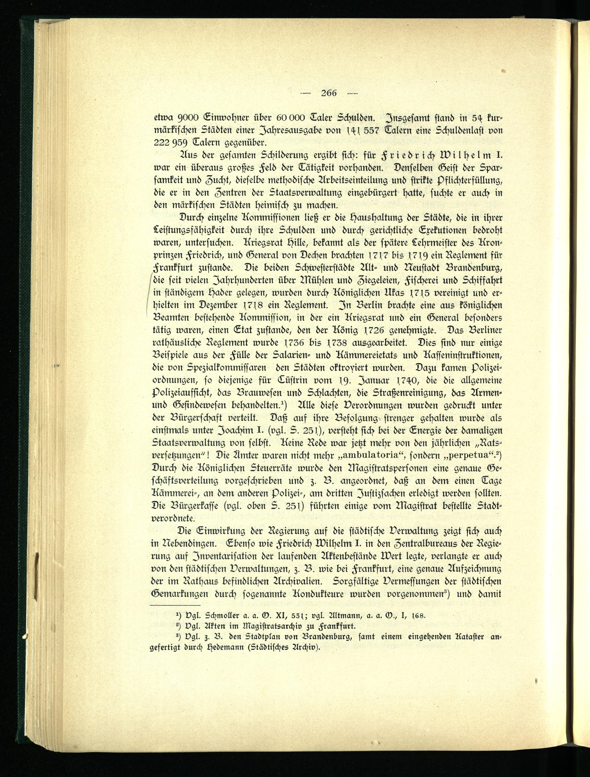 Durch einzelne Kommissionen ließ er die Haushaltung der Städte, die in ihrer Leistungsfähigkeit durch ihre Schulden und durch gerichtliche Exekutionen bedroht waren, untersuchen. Kriegsrat Hille, bekannt als der spätere Lehrmeister des Kronprinzen Friedrich, und General von Dechen brachten (7(7 bis (7(9 ein Reglement für Frankfurt zustande. Die beiden Schwesterstädte Alt- und Neustadt Brandenburg, /die seit vielen Jahrhunderten über Mühlen und Ziegeleien, Fischerei und Schisfahrt / in ständigem Hader gelegen, wurden durch Königlichen Ukas 1.715 vereinigt und erhielten im Dezember (7(8 ein Reglement. In Berlin brachte eine aus königlichen Beamten bestehende Kommission, in der ein Kriegsrat und ein General besonders tätig waren, einen Etat zustande, den der König (726 genehmigte. Das Berliner rathäusliche Reglement wurde (756 bis (738 ausgearbeitet. Dies sind nur einige Beispiele aus der Fülle der Salarien- und Kämmereietats und Kasseninstruktionen, die von Spezialkommissaren den Städten oktroyiert wurden. Dazu kamen polizei- ordnungen, so diejenige für Tüstrin vom (9- Januar (7H0, die die allgemeine Polizeiaufsicht, das Brauwesen und Schlachten, die Straßenreinigung, das Armen- und Gesindewesen behandelten?) Alle diese Verordnungen wurden gedruckt unter der Bürgerschaft verteilt. Daß auf ihre Befolgung strenger gehalten wurde als einstmals unter Joachim I. (vgl. S. 25 H, versteht sich bei der Energie der damaligen Staatsverwaltung von selbst. Keine Rede war jetzt mehr von den jährlichen „Ratsversetzungen" ! Die Ämter waren nicht mehr „ambulatoria", sondern „perpetua"?) Durch die Königlichen Steuerräte wurde den Magistratspersonen eine genaue Geschäftsverteilung vorgeschrieben und z. B. angeordnet, daß an dem einen Tage Kämmerei-, an dem anderen Polizei-, am dritten Iustizsachen erledigt werden sollten. Die Bürgerkasse (vgl. oben S. 251) führten einige vom Magistrat bestellte Stadtverordnete.
