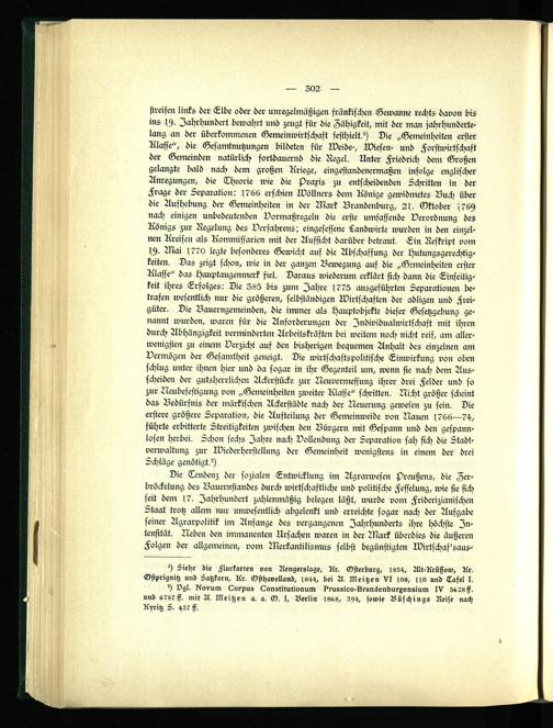 streifen links der Elbe oder der unregelmäßigen fränkischen Gewanne rechts davon bis ins l9- Jahrhundert bewahrt und zeugt für die Zähigkeit, mit der man jahrhundertelang an der überkommenen Gemeinwirtschaft festhielt?) Die „Gemeinheiten erster Masse", die Gesamtnutzungen bildeten für Weide-, Wiesen- und Forstwirtschaft der Gemeinden natürlich fortdauernd die Regel. Unter Friedrich den: Großen gelangte bald nach dem großen Kriege, eingestandenermaßen infolge englischer Anregungen, die Theorie wie die Praxis zu entscheidenden Schritten in der Frage der Separation: s766 erschien Wöllners dem Könige gewidmetes Buch über die Aufhebung der Gemeinheiten in der Mark Brandenburg, 2s. Oktober s769 nach einigen unbedeutenden Vormaßregeln die erste umfassende Verordnung des Königs zur Regelung des Verfahrens; eingesessene Landwirte wurden in den einzelnen Kreisen als Kommissarien mit der Aufsicht darüber betraut. Tin Reskript vom 1 . 9 . Akai s770 legte besonderes Gewicht auf die Abschaffung der Hutungsgerechtigkeiten. Das zeigt schon, wie in der ganzen Bewegung auf die „Gemeinheiten erster Klasse" das Hauptaugenmerk fiel. Daraus wiederum erklärt sich dann die Einseitigkeit ihres Erfolges: Die 585 bis zum Jahre s775 ausgeführten Separationen betrafen wesentlich nur die größeren, selbständigen Wirtschaften der adligen und Freigüter. Die Bauerngenreinden, die immer als Hauptobjekte dieser Gesetzgebung genannt wurden, waren für die Anforderungen der Individualwirtschaft mit ihren durch Abhängigkeit verminderten Arbeitskräften bei weitern noch nicht reif, am allerwenigsten zu einem Verzicht auf den bisherigen bequemen Anhalt des einzelnen am Vermögen der Gesamtheit geneigt. Die wirtschaftspolitische Einwirkung von oben schlug unter ihnen hier und da sogar in ihr Gegenteil um, wenn sie nach dem Ausscheiden der gutsherrlichen Ackerstücke zur Neuvermessung ihrer drei Felder und so zur Neubefestigung von „Gemeinheiten zweiter Klasse" schritten. Nicht größer scheint das Bedürfnis der märkischen Ackerstädte nach der Neuerung gewesen zu sein. Die erstere größere Separation, die Aufteilung der Gemeinweide von Nauen s766—74, führte erbitterte Streitigkeiten zwischen den Bürgern mit Gespann und den gespannlosen herbei. Schon sechs Jahre nach Vollendung der Separation sah sich die Stadtverwaltung zur Wiederherstellung der Gemeinheit wenigstens in einem der drei Schläge genötigt?)
