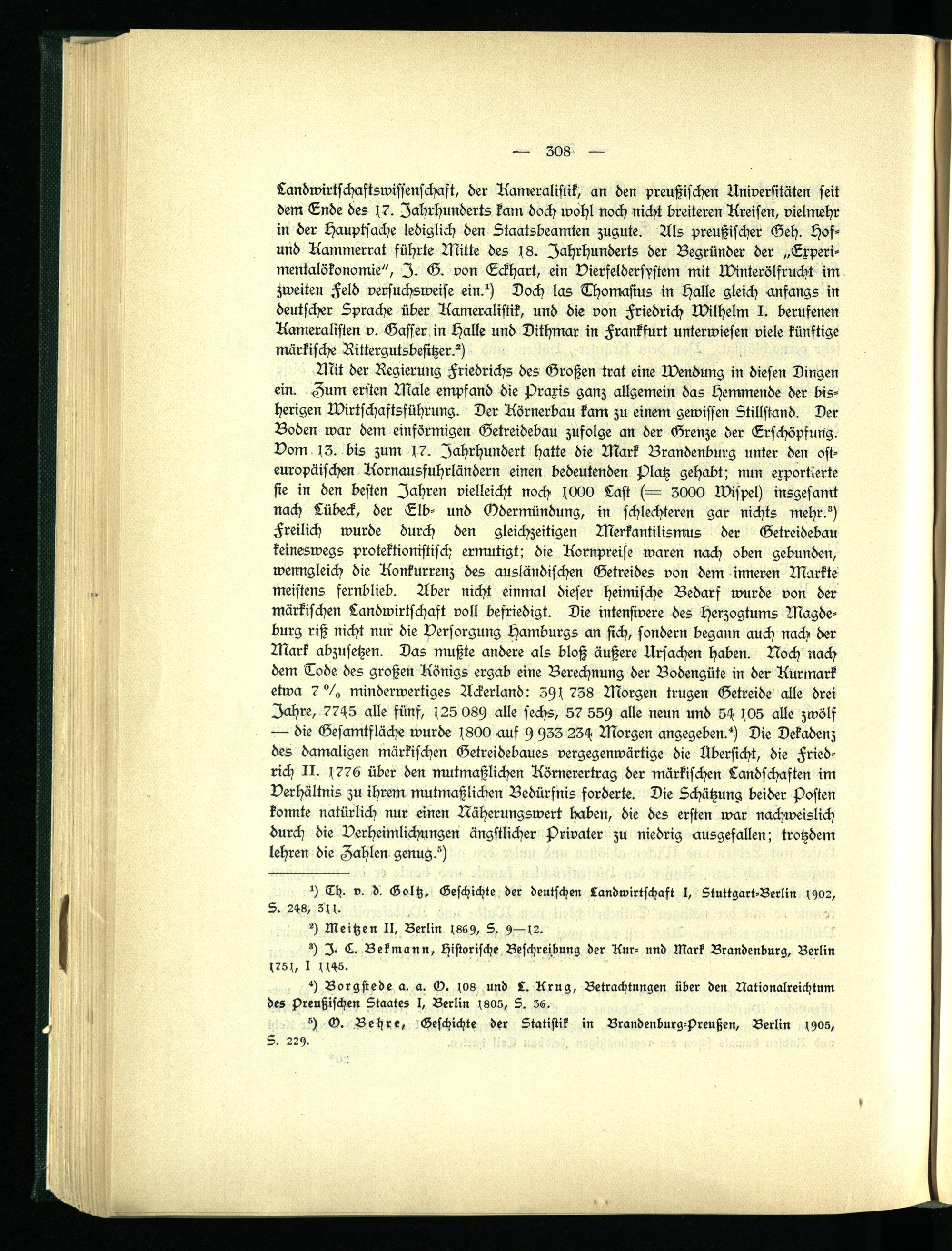 Landwirtschaftswissenschaft, der Kameralistik, an den preußischen Universitäten seit dem Ende des s7. Jahrhunderts kam doch wohl noch nicht breiteren Kreisen, vielmehr in der Hauptsache lediglich den Staatsbeamten zugute. Als preußischer Geh. Hof- und Kammerrat führte Mitte des s8. Jahrhunderts der Begründer der „Expsri- mentalökonomie", I. G. von Eckhart, ein Vierfeldersystem mit Winterölfrucht im zweiten Feld versuchsweise ein?) Doch las Thomasius in Halle gleich anfangs in deutscher Sprache über Kameralistik, und die von Friedrich Wilhelm I. berufenen Kameralisten v. Gasser in Halle und Dithmar in Frankfurt unterwiesen viele künftige märkische Rittergutsbesitzer?)