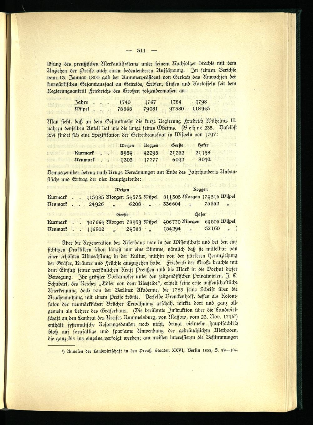 Man sieht, daß an dem Gesamtmehr die kurze Regierung Friedrich Wilhelms II. nahezu denselben Anteil hat wie die lange seines Oheims. (Lehre 235. Daselbst 23H findet sich eine Spezifikation der Getreideaussaat in Mispeln von (797: