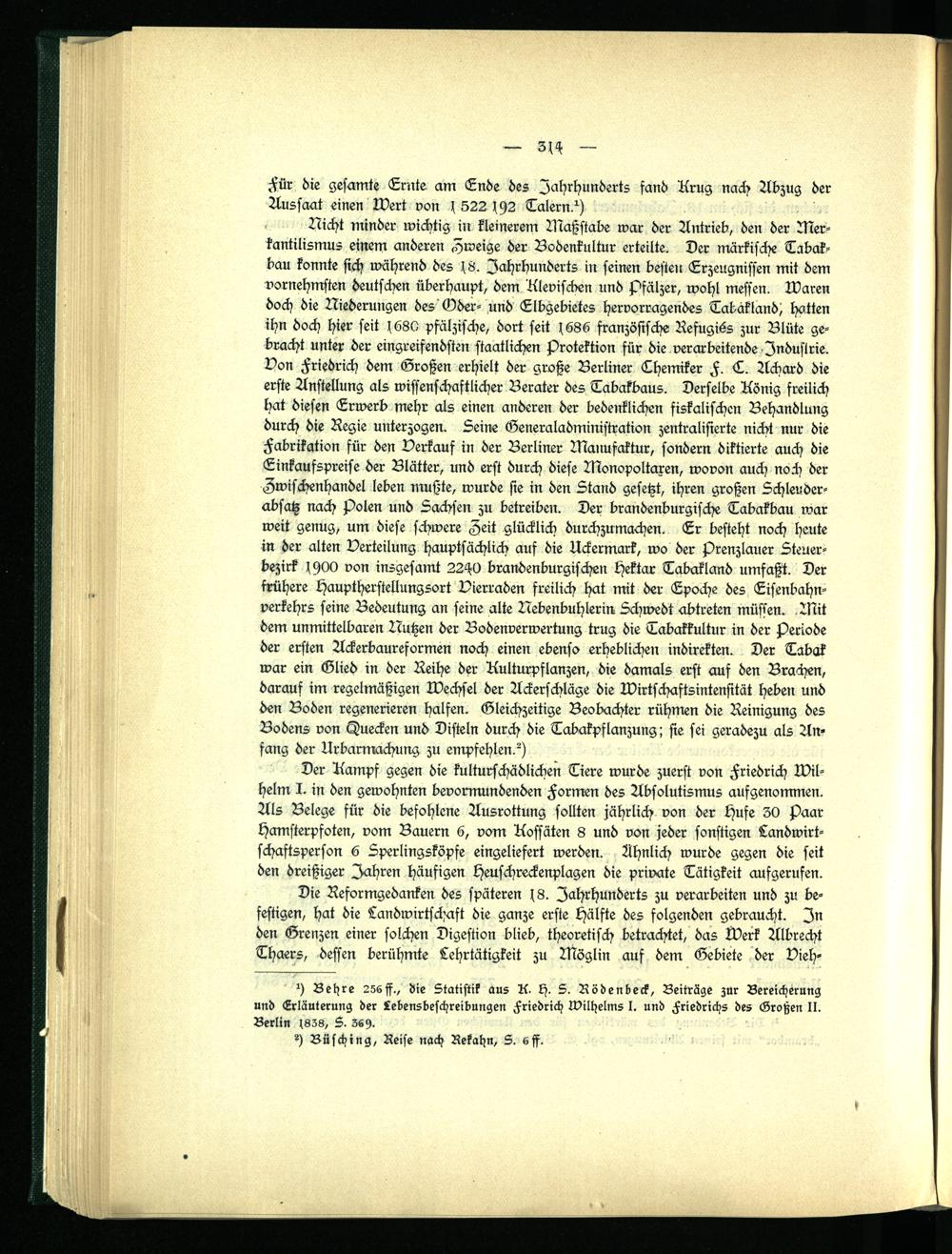 Nicht minder wichtig in kleinerem Maßstabe war der Antrieb, den der Mer- kantilismus einem anderen Zweige der Bodenkultur erteilte. Der märkische Tabakbau konnte sich während des s8. Jahrhunderts in seinen besten Erzeugnissen mit dem vornehmsten deutschen überhaupt, dem Kleviscken und Pfälzer, wohl messen. Waren doch die Niederungen des Cder- und Elbgebietes hervorragendes Tabäkland, hotten ihn doch hier seit 1680 pfälzische, dort seit f686 französische Refugiss zur Blüte gebracht unter der eingreifendsten staatlichen Protektion für die verarbeitende Industrie. Von Friedrich dem Großen erhielt der große Berliner Themiker F. <L. Achard die erste Anstellung als wissenschaftlicher Berater des Tabakbaus. Derselbe König freilich hat diesen Erwerb mehr als einen anderen der bedenklichen fiskalischen Behandlung durch die Regie unterzogen. Seine Generaladministration zentralisierte nicht nur die Fabrikation für den Verkauf in der Berliner Manufaktur, sondern diktierte auch die Einkaufspreise der Blätter, und erst durch diese Monopoltaren, wovon auch noch der Zwischenhandel leben mußte, wurde sie in den Stand gesetzt, ihren großen Schleuderabsatz nach Polen und Sachsen zu betreiben. Der brandenburgische Tabakbau war weit genug, um diese schwere Zeit glücklich durchzumachen. Er besteht noch heute in der alten Verteilung hauptsächlich auf die Uckermark, wo der Prenzlauer Steuerbezirk syOO von insgesamt 22?0 brandenburgischen Hektar Tabakland umfaßt. Der frühere Hauptherstellungsort Vierraden freilich hat mit der Epoche des Eisenbahnverkehrs seine Bedeutung an seine alte Nebenbuhlerin Schwedt abtreten müssen. .Mit dem unmittelbaren Nutzen der Bodenverwertung trug die Tabakkultur in der Periode der ersten Ackerbaureformen noch einen ebenso erheblichen indirekten. Der Tabak war ein Glied in der Reihe der Kulturpflanzen, die damals erst auf den Brachen, darauf im regelmäßigen Wechsel der Ackerschläge die Wirtschaftsintensität heben und den Boden regenerieren halfen. Gleichzeitige Beobachter rühmen die Reinigung des Bodens von Quecken und Disteln durch die Tabakpflanzung; sie sei geradezu als Anfang der Urbarmachung zu empfehlen?)