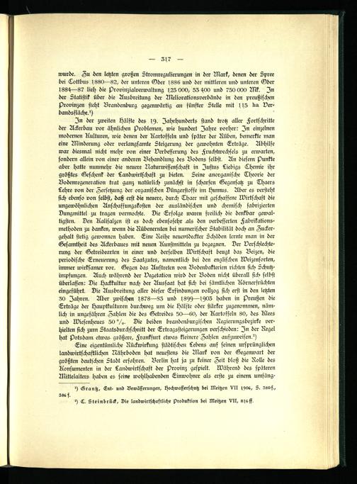 Eine eigentümliche Rückwirkung städtischen Lebens auf seinen ursprünglichen landwirtschaftlichen Nährboden hat neuestens die Mark von der Gegenwart der größten deutschen Stadt erfahren. Berlin hat ja zu keiner Zeit bloß die Rolle des Konsumenten in der Landwirtschaft der Provinz gespielt, während des späteren Mittelalters haben es seine wohlhabenden Einwohner als erste zu einem umfängst Grantz, Lnt- und Bewässerungen, Hochwafferschutz bei Meitzen VII lyos, S. Z80f.,