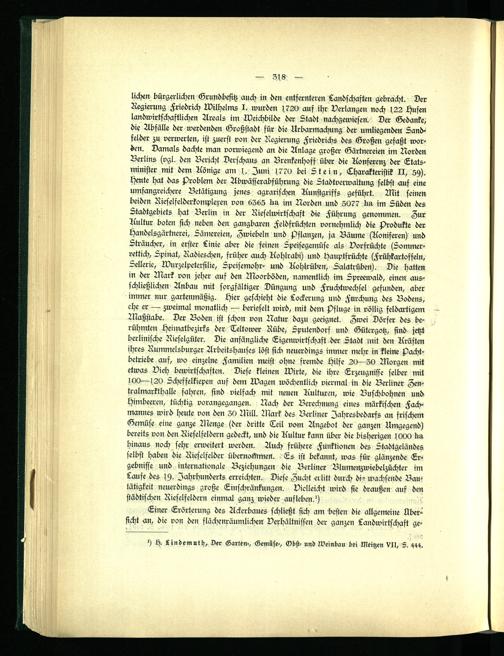 liehen bürgerlichen Grundbesitz auch in den entfernteren Landschaften gebracht. Der Regierung Friedrich Wilhelms I. wurden 1720 auf ihr Verlangen noch 122 Hufen landwirtschaftlichen Areals im Weichbilde der Stadt nachgewiesen. Der Gedanke, die Abfälle der werdenden Großstadt für die Urbarmachung der umliegenden Sandfelder zu verwerten, ist zuerst von der Regierung Friedrichs des Großen gefaßt worden. Damals dachte man vorwiegend an die Anlage großer Gärtnereien im Norden Berlins (vgl. den Bericht Derschaus an Brenkenhoff über die Konferenz der Etats- minister mit dem Könige am I. Juni 1770 bei Stein, Lharakteriftik II, 59). Heute hat das Problem der Abwäfserabführung die Stadtverwaltung selbst auf eine umfangreichere Betätigung jenes agrarischen Kunstgriffs geführt. Mit seinen beiden Rieselfelderkompleren von 6365 lw im Norden und 3077 Iw im Süden des Stadtgebiets hat Berlin in der Rieselwirtschaft die Führung genommen. Zur Kultur boten sich neben den gangbaren Feldfrüchten vornehmlich die Produkte der Handelsgärtnerei, Sämereien, Zwiebeln und Pflanzen, ja Bäume (Koniferen) und Sträucher, in erster Linie aber die feinen Speisegemüse als Vorfrüchte (Sommerrettich, Spinat, Radieschen, früher auch Kohlrabi) und Hauptfrüchte (Frühkartoffeln, Sellerie, Wurzelpetersilie, Speisemohr- und Kohlrüben, Salatrüben). Die hatten in der Mark von jeher auf den Moorböden, namentlich im Spreewald, einen ausschließlichen Anbau mit sorgfältiger Düngung und Fruchtwechsel gefunden, aber immer nur gartenmäßig. Hier geschieht die Lockerung und Furchung des Bodens, ehe er — zweimal monatlich —- berieselt wird, mit dem Pfluge in völlig feldartigem Maßstabe. Der Boden ist schon von Natur dazu geeignet. Zwei Dörfer des berühmten Heimatbezirks der Teltower Rübe, Sputendorf und Gütergotz, sind jetzt berlinische Rieselgüter. Die anfängliche Eigenwirtschaft der Stadt mit den Kräften ihres Rummelsburger Arbeitshauses löst sicb neuerdings immer mehr in kleine pachtbetriebe auf, wo einzelne Familien meist ohne fremde Hilfe 20—30 Morgen mit etwas Vieh bewirtschaften. Diese kleinen Wirte, die ihre Erzeugnisse selber mit 100—120 Scheffelkiepen auf dem Wagen wöchentlich viermal in die Berliner Zentralmarkthalle fahren, sind vielfach mit neuen Kulturen, wie Buschbohnen und Himbeeren, tüchtig vorangegangen. Nach der Berechnung eines märkischen Fachmannes wird heute von den 30 Mill. Mark des Berliner Iahresbedarfs an frischem Gemüse eine ganze Menge (der dritte Teil vom Angebot der ganzen Umgegend) bereits von den Rieselfeldern gedeckt, und die Kultur kann über die bisherigen 1000 kur hinaus noch sehr erweitert werden. Auch frühere Funktionen des Stadtgeländes, selbst haben die Rieselfelder übernommen. Es ist bekannt, was für glänzende Ergebnisse und internationale Beziehungen die Berliner Blumenzwiebelzüchter im Laufe des 19. Jahrhunderts erreichten. Diese Zucht erlitt durch di-! wachsende Bautätigkeit neuerdings große Einschränkungen. Vielleicht wird sie draußen auf den städtischen Rieselfeldern einmal ganz wieder aufleben?)