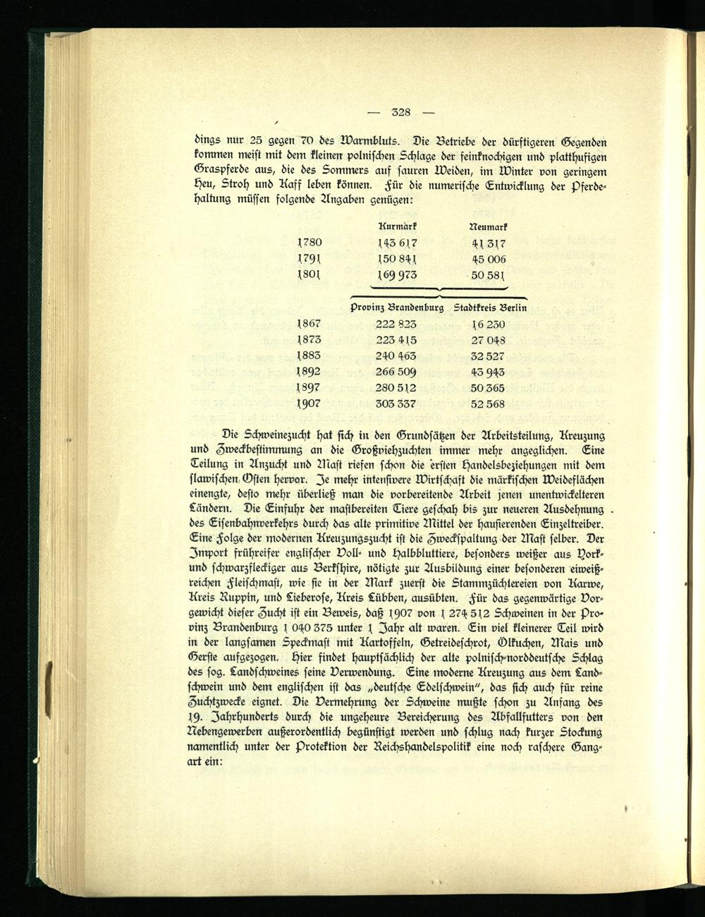 Die Schweinezucht hat sich in den Grundsätzen der Arbeitsteilung, Kreuzung und Zweckbestimmung an die Großviehzuchten immer mehr angeglichen. Line Teilung in Anzucht und Blast riefen schon die ersten Handelsbeziehungen mit dem slawischen, Osten hervor. Je mehr intensivere Wirtschaft die märkischen Weideflächen einengte, desto mehr überließ man die vorbereitende Arbeit jenen unentwickelteren Tündern. Die Einfuhr der mastbereiten Tiere geschah bis zur neueren Ausdehnung des Eisenbahnverkehrs durch das alte primitive Mittel der hausierenden Einzeltreiber. Line Folge der modernen Kreuzungszucht ist die Zweckspaltung der Mast selber. Der Import frühreifer englischer Voll- und Halbbluttiere, besonders weißer aus tzork- und schwarzsleckiger aus Berkshire, nötigte zur Ausbildung einer besonderen eiweißreichen Fleischmast, wie sie in der Mark zuerst die Stammzüchtereien von Karwe, Kreis Ruppin, und Lieberose, Kreis Lübben, ausübten. Für das gegenwärtige Vorgewicht dieser Zucht ist ein Beweis, daß 1907 von s 27H 512 Schweinen in der Provinz Brandenburg I OHO 375 unter j Jahr alt waren. Ein viel kleinerer Teil wird in der langsamen Speckmast mit Kartoffeln, Getreideschrot, Ölkuchen, Mais und Gerste aufgezogen, hier findet hauptsächlich der alte polnisch-norddeutsche Schlag des sog. Landschweines seine Verwendung. Eine moderne Kreuzung aus dem Landschwein und dem englischen ist das „deutsche Edelschwein", das sich auch für reine Zuchtzwecke eignet. Die Vermehrung der Schweine mußte schon zu Anfang des 19. Jahrhunderts durch die ungeheure Bereicherung des Abfallfutters von den Nebengerverben außerordentlich begünstigt werden und schlug nach kurzer Stockung namentlich unter der Protektion der Reichshandelspolitik eine noch raschere Gangart ein: