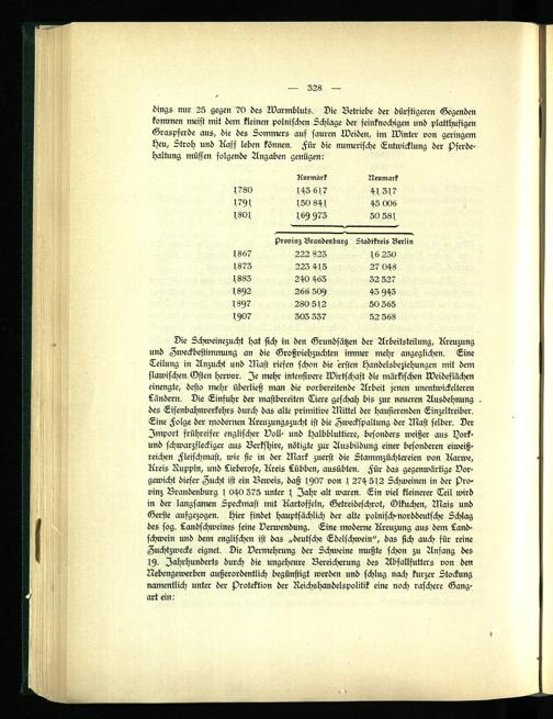 bings nur 25 gegen 70 des Warmbluts. Die Betriebe der dürftigeren Gegenden kommen meist mit dem kleinen polnischen Schlage der feinknochigen und platthusigen Graspferde aus, die des Sommers auf sauren Weiden, im Winter von geringem Heu, Stroh und Kaff leben können. Für die numerische Entwicklung der pferde- haltung müssen folgende Angaben genügen: