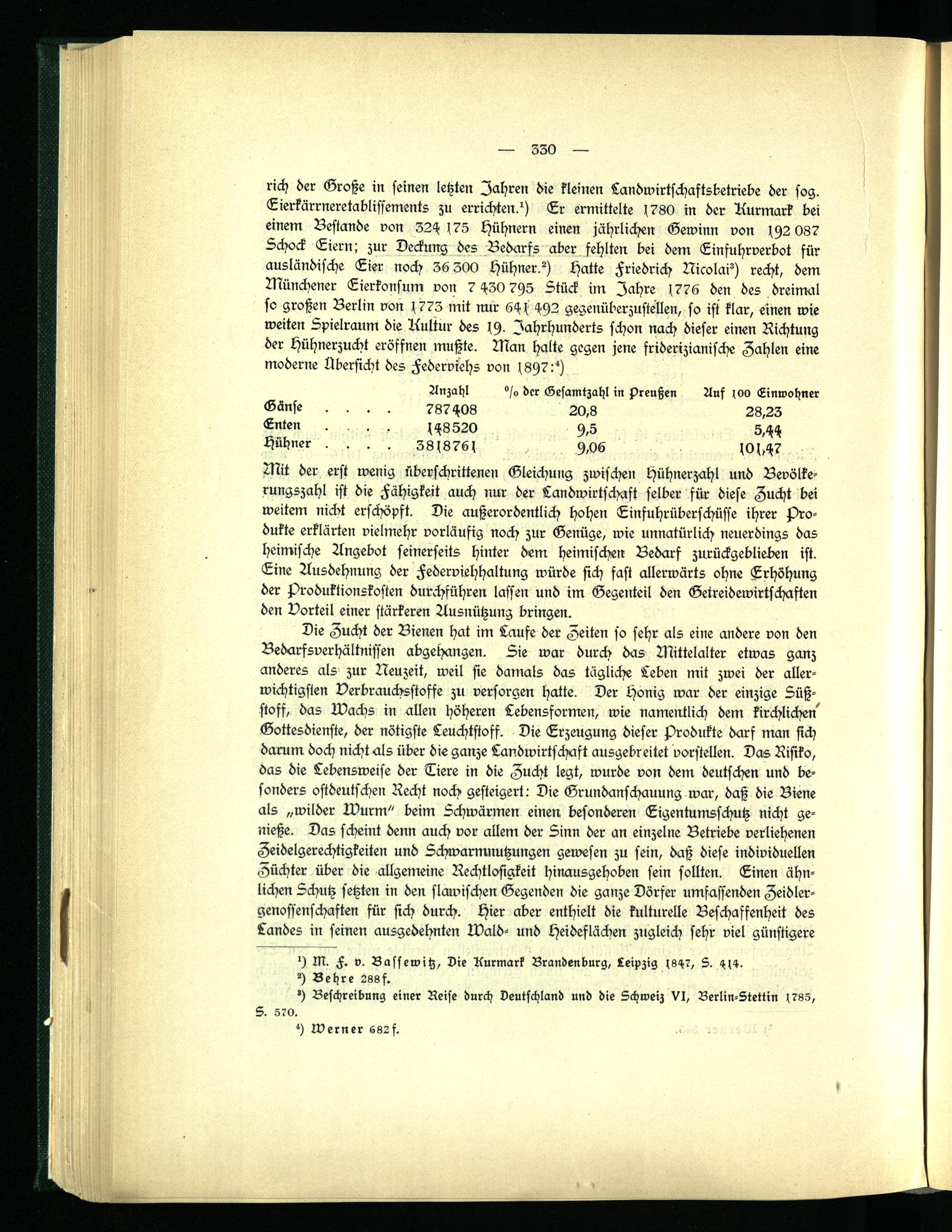 rich der Große in seinen letzten fahren die kleinen Landwirtschaftsbetriebe der sog. Eierkärrneretablissements zu errichten?) Er ermittelte 1780 in der Aurmark bei einem Bestände von 324 175 Hühnern einen jährlichen Gewinn von Ich? 087 Schock Eiern; zur Deckung des Bedarfs aber fehlten bei dem Einfuhrverbot für ausländische Eier noch 36 300 Hühner?) Hatte Friedrich Nicola?) recht, dem Münchener Lierkonsum von 7 430 7H5 Stück im Jahre 1776 den -es dreimal so großen Berlin von 1 773 mit nur 64 s 4H2 gegenüberzustellen, so ist klar, einen wie weiten Spielraum die Kultur des Ich- Jahrhunderts schon nach dieser einen Richtung der Hühnerzucht eröffnen mußte. Man halte gegen jene friderizianische Zahlen eine moderne Übersicht des Federviehs von I 897 ?)