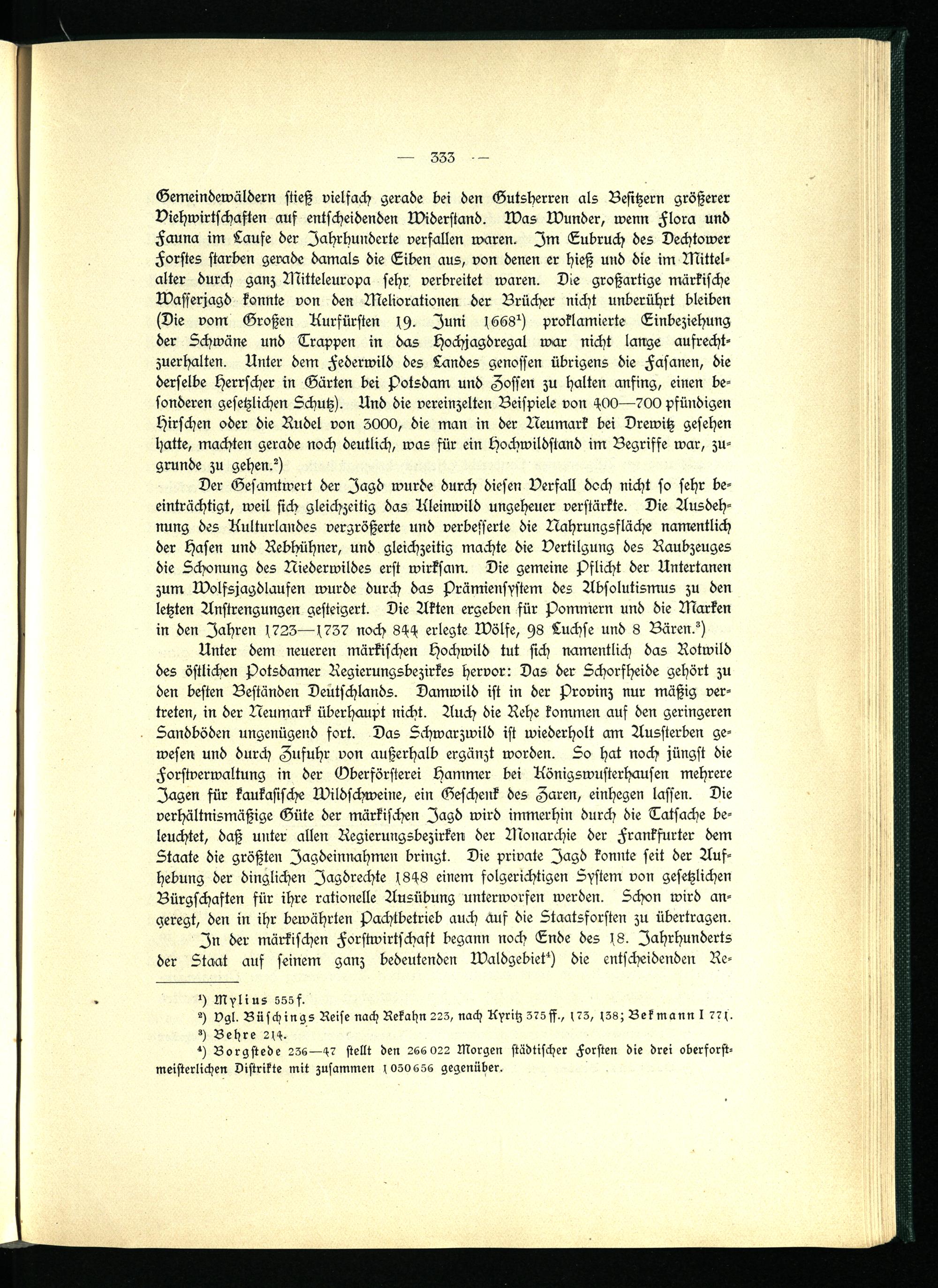 Gemeindewäldern stieß vielfach gerade bei den Gutsherren als Besitzern größerer Viehwirtschaften aus entscheidenden Widerstand. Was Wunder, wenn Flora und Fauna im Laufe der Jahrhunderte verfallen waren. Im Eubruch des Dechtower Forstes starben gerade damals die Eiben aus, von denen er hieß und die im Mittel- alter durch ganz Mitteleuropa sehr verbreitet waren. Die großartige märkische Wasserjagd konnte von den Meliorationen der Brücher nicht unberührt bleiben (Die vom Großen Kurfürsten 49. Juni 1668^) proklamierte Einbeziehung der Schwäne und Trappen in das Hochjagdregal war nicht lange aufrechtzuerhalten. Unter dem Federwild des Landes genossen übrigens die Fasanen, die derselbe Herrscher in Gärten bei Potsdam und Zossen zu halten ansing, einen besonderen gesetzlichen Schutz). Und die vereinzelten Beispiele von 400—700 pfündigen Hirschen oder die Rudel von 5000, die man in der Neumark bei Drewitz gesehen hatte, machten gerade noch deutlich, was für ein Hochwildstand im Begriffe war, zugrunde zu gehen?)