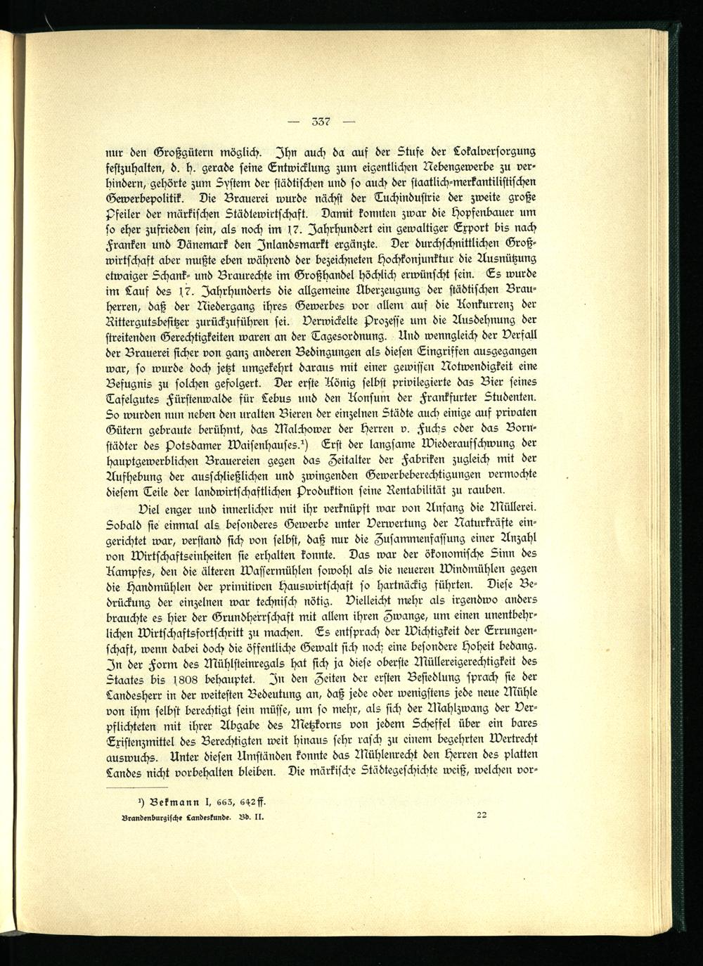 nur den Großgütern möglich. Ihn auch da auf der Stufe der Lokalversorgung festzuhalten, d. h. gerade seine Entwicklung zum eigentlichen Nebengewerbe zu verhindern, gehörte zum System der städtischen und so auch der staatlich-merkantilistischen Gewerbepolitik. Die Brauerei wurde nächst der Tuchindustrie der zweite große Pfeiler der märkischen Städtewirtschaft. Damit konnten zwar die Hopfenbauer um so eher zufrieden sein, als noch im f7. Jahrhundert ein gewaltiger Export bis nach Franken und Dänemark den Inlandsmarkt ergänzte. Der durchschnittlichen Großwirtschaft aber mußte eben während der bezeichneten Hochkonjunktur die Ausnützung etwaiger Schank- und Braurechte im Großhandel höchlich erwünscht sein. Es wurde im Lauf des f7. Jahrhunderts die allgemeine Überzeugung der städtischen Brauherren, daß der Niedergang ihres Gewerbes vor allem auf die Konkurrenz der Rittergutsbesitzer zurückzuführen sei. Verwickelte Prozesse um die Ausdehnung der streitenden Gerechtigkeiten waren an der Tagesordnung. Und wenngleich der Verfall der Brauerei sicher von ganz anderen Bedingungen als diesen Eingriffen ausgegangen war, so wurde doch jetzt umgekehrt daraus mit einer gewissen Notwendigkeit eine Befugnis zu solchen gefolgert. Der erste König selbst privilegierte das Bier seines Tafelgutes Fürstenwalde für Lebus und den Konsum der Frankfurter Studenten. So wurden nun neben den uralten Bieren der einzelnen Städte auch einige auf privaten Gütern gebraute berühmt, das Nkalchower der Herren v. Fuchs oder das Bornstädter des Potsdamer Waisenhauses?) Erst der langsame Wiederaufschwung der hauptgewerblichen Brauereien gegen das Zeitalter der Fabriken zugleich mit der Aufhebung der ausschließlichen und zwingenden Gewerbeberechtigungen vermochte diesem Teile der landwirtschaftlichen Produktion seine Rentabilität zu rauben.