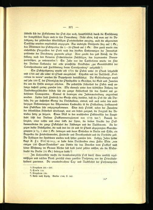 Ein Paketpostzwang wurde erst 1,7 i 5 für Pakete unter 20 Pfund festgestellt und s766 auf alle unter 40 Pfund ausgedehnt. Lilpakete mit der Aufschrift ,,4'ori- eulum in morn" wurden für Doppelporto berücksichtigt. Bei Geldsendungen ward auf jede l 00 T. der Pfennigsatz der Psundpakete in Groschen, bei Gold und Juwelen bis um die Hälfte weniger, erhoben. Die postalische Sicherheit der Pakete muß anfangs äußerst gering gewesen sein. Wie ehemals unter dem städtischen Anhang der Raubrittergeschlechter bildete sich ein ganzer Hehlerstand für den Handel mit gestohlenen Transporten. Einmal ist deswegen eine Iudenaustreibung angeordnet worden. Später hielt Friedrich der Große eifrig darüber, daß die Post für alle Verluste, bis zur äußersten Grenze des Verschuldens, eintrat, und auch unter den weitherzigen Bestimmungen des Allgemeinen Landrechts ist die Posthaftung fortdauernd dem Publikum sehr entgegengekommen. Eben diese Politik, neben der Zunahme der öffentlichen Sicherheit überhaupt, war am besten geeignet, die Sorgfalt des Betriebes stetig zu steigern. Einen Blick in den wachsenden paketverkehr der Hauptstadt läßt das Berliner Packkammerreglement von 1719 tun?) Danach besorgten, einer rechts und einer links der Spree, die beiden Anechte des Packkammerboten die ganze paketfahrt der Residenzen und der Nachbarorte. Sie bezogen dafür Bestellgelder, die nach drei bei 25 und 50 Pfund abgegrenzten Gewichtsgruppen je ?-2, s oder 2 Gr. betrugen und deren Einfaches in Berlin und Eölln, ein Doppeltes für Friedrichswerder, Friedrich- und Dorotheenstadt und die Vorstädte galt. Die Rolltaxen der Spediteure werden noch höher gewesen sein. Sechzig Jahre später klagt A. Fr. Büsching, er habe beim Verschreiben eines Fasses Wein „von einigen sOO Auart-Bouteillen" aus Stettin für das Anrollen vom Packhöf nach seiner Wohnung im Grauen Kloster fast halb soviel zahlen müssen, als die Wasserfracht bis Berlin (s4 Gr.) betragen hatte?)