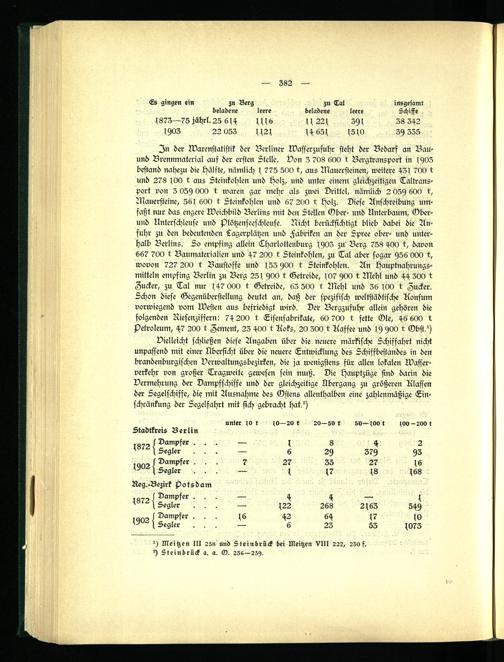 Vielleicht schließen diese Angaben über die neuere märkische Schiffahrt nicht unpassend mit einer Übersicht über die neuere Entwicklung des Schiffbestandes in den brandenburgischen Verwaltungsbezirken, die ja wenigstens für allen lokalen Wasserverkehr von großer Tragweite gewesen sein muß. Die Hauptzüge sind darin die Vermehrung der Dampfschiffe und der gleichzeitige Übergang zu größeren Massen der Segelschiffe, die mit Ausnahme des Ostens allenthalben eine zahlenmäßige Einschränkung der Segelfahrt mit sich gebracht hat?)