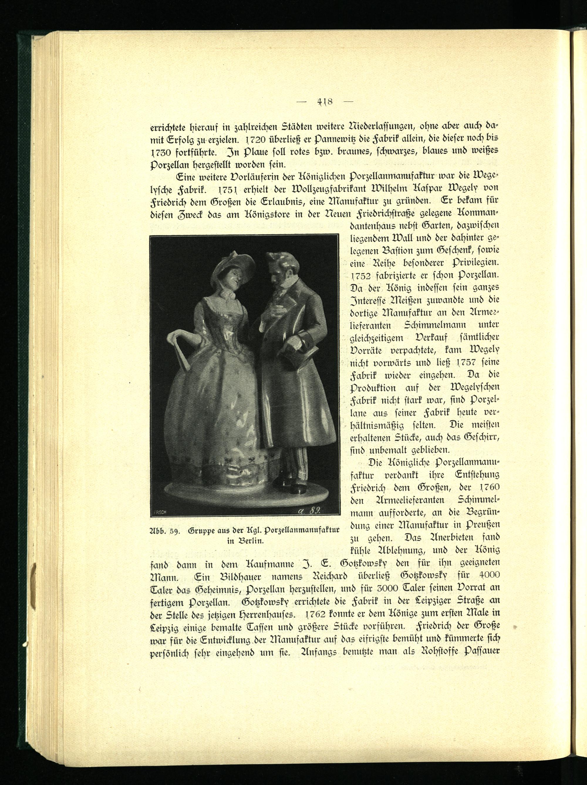 Eine weitere Vorläuferin der Königlichen porzellanmanusaktur war die Wege- lysche Fabrik. 1,751 erhielt der Wollzeugsabrikant Wilhelm Kaspar Wegely von Friedrich dem Großen die Erlaubnis, eine Manufaktur zu gründen. Er bekam für diesen Zweck das am Königstore in der Neuen Friedrichstraße gelegene Kommandantenhaus nebst Garten, dazwischen liegendem Wall und der dahinter gelegenen Bastion zum Geschenk, sowie eine Reihe besonderer Privilegien. s752 fabrizierte er schon Porzellan. Da der König indessen sein ganzes Interesse Meißen zuwandte und die dortige Manufaktur an den Armeelieferanten Schimmelmann unter gleichzeitigem Verkauf sämtlicher Vorräte verpachtete, kam Wegely nicht vorwärts und ließ s757 seine Fabrik wieder eingehen. Da die Produktion aus der Wegelyschen Fabrik nicht stark war, sind Porzellane aus seiner Fabrik heute verhältnismäßig selten. Die meisten erhaltenen Stücke, auch das Geschirr, sind unbemalt geblieben.