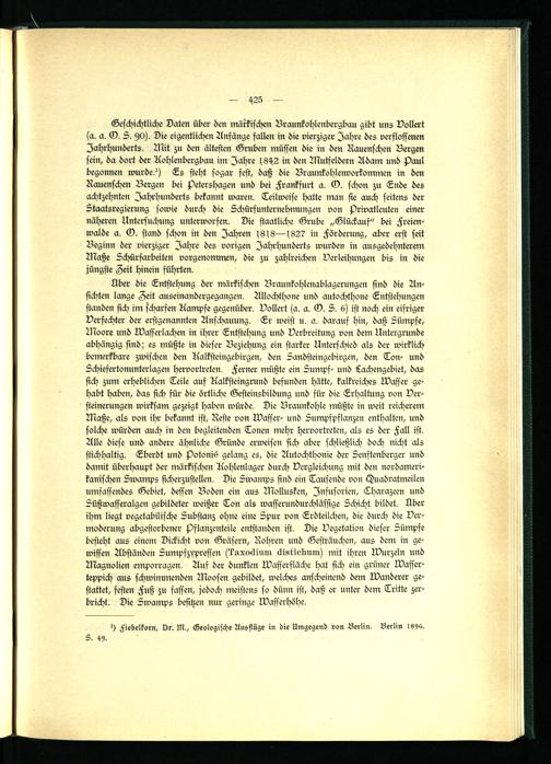 Geschichtliche Daten über den märkischen Braunkohlenbergbau gibt uns Bollert (a. a. G. S. 90 ). Die eigentlichen Anfänge fallen in die vierziger Jahre des verflossenen Jahrhunderts. Nit zu den ältesten Gruben müssen die in den Rauenschen Bergen sein, da dort der Kohlenbergbau im Jahre 1842 in den Mutfeldern Adam und Paul begonnen wurde?) Es steht sogar fest, daß die Braunkohlenvorkommen in dm Rauenschen Bergen bei Petershagen und bei Frankfurt a. G. schon zu Ende des achtzehnten Jahrhunderts bekannt waren. Teilweise hatte man sie auch seitens der Staatsregierung sowie durch die Schürfunternehmungen von Privatleuten einer näheren Untersuchung unterworfen. Die staatliche Grube „Glückauf" bei Freienwalde a. G. stand schon in den Jahren 4348 —4827 in Förderung, aber erst seit Beginn der vierziger Jahre des vorigen Jahrhunderts wurden in ausgedehnterem Maße Schürfarbeiten vorgenommen, die zu zahlreichen Verleihungen bis in die jüngste Zeit hinein führten.