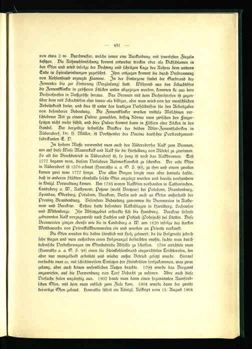 von etwa 2 IN Durchmesser, welche innen eine Auskleidung mit feuerfesten Ziegeln besitzen. Die Rohmehlmischung kommt entweder trocken oder als Dickschlamm in den Ofen und wird infolge der Drehung und schrägen Lage des Rohres dem unteren Ende in Spiralwindungen zugeführt. Zhm entgegen kommt die durch Verbrennung von Kohlenstaub erzeugte Flamme. Zn der Sinterzone findet der Garbrand des Zementes bis zur Sinterung (Verglasung) statt. Während aus den Schachtöfen die Zementklinker in größeren Stücken unten abgezogen werden, kommen sie aus dem Drehrohrofen in Nußgröße heraus. Das Brennen mit dem Drehrohrofen ist gegenüber dem mit Schachtöfen eher teurer als billiger, aber man wird von der menschlichen Arbeitskraft freier, und dies ist unter den heutigen Verhältnissen für den Arbeitgeber von besonderer Bedeutung. Die Zementklinker werden mittels Maschinen verschiedener Art zu einem Pulver gemahlen, dessen Körner man zwischen den Fingerspitzen nicht mehr fühlt, und dies Pulver kommt dann in Fässern oder Säcken in den Handel. Der derzeitige technische Direktor der beiden Adler-Zementfabriken in Rüdersdorf, De. h. Müller, ist Vorsitzender des Vereins deutscher Portlandzementfabrikanten E. V.